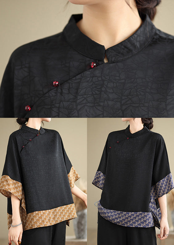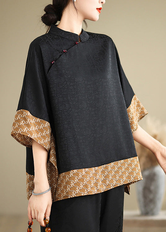 Chinese Style Brown Print Patchwork Silk Shirts Batwing Sleeve