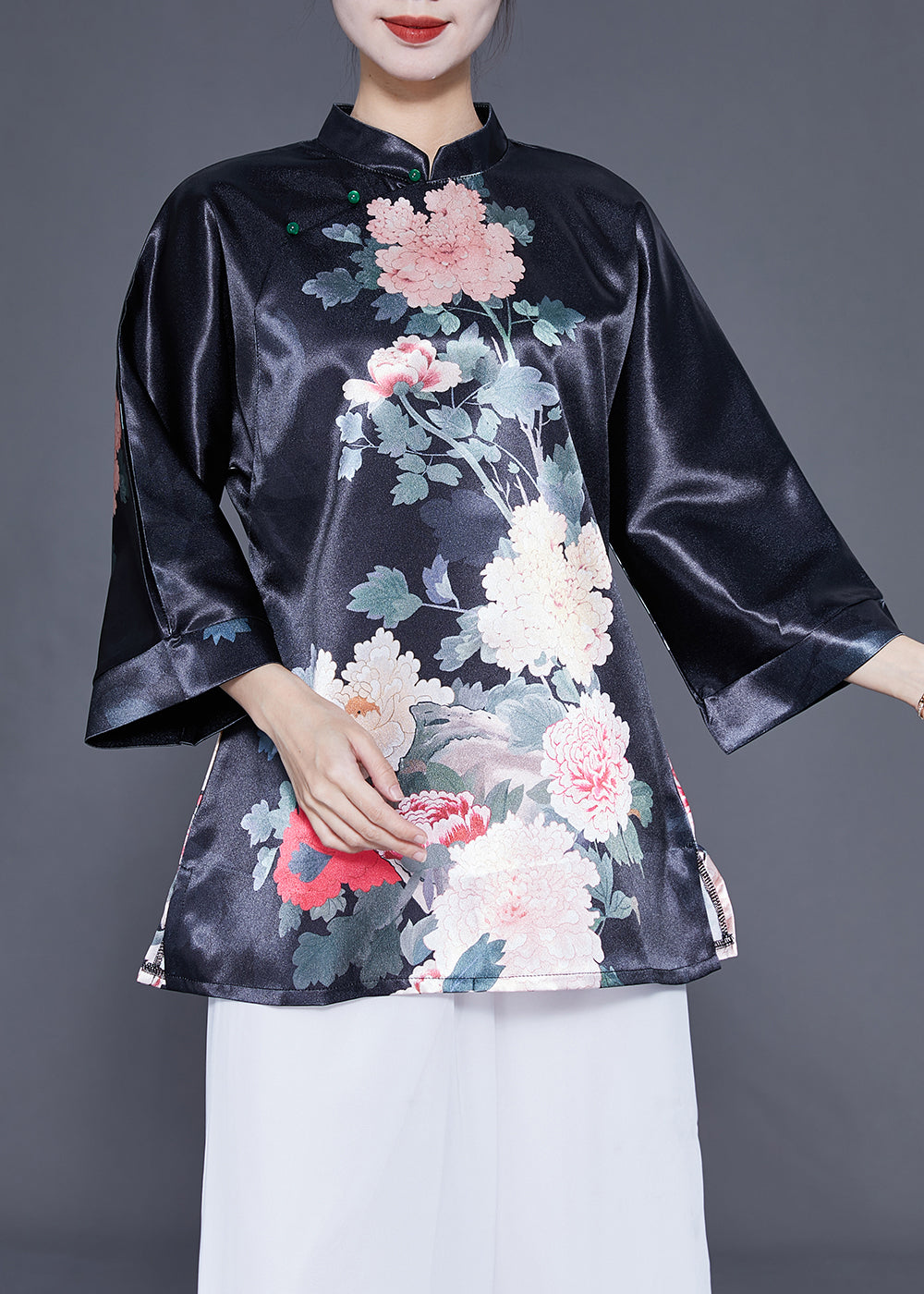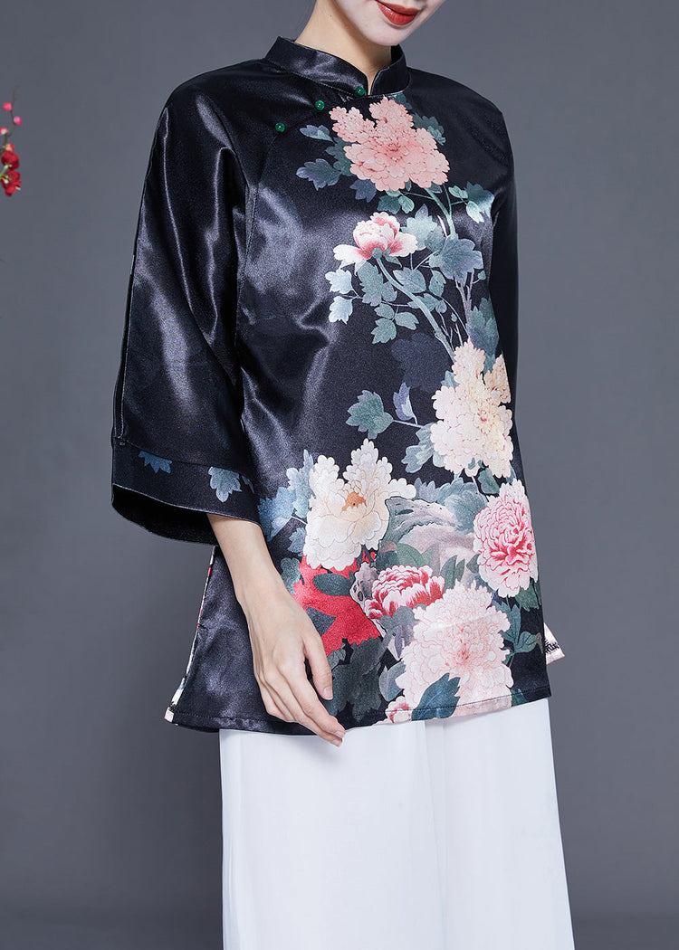 Diy Black Stand Collar Print Side Open Silk Shirt Bracelet Sleeve