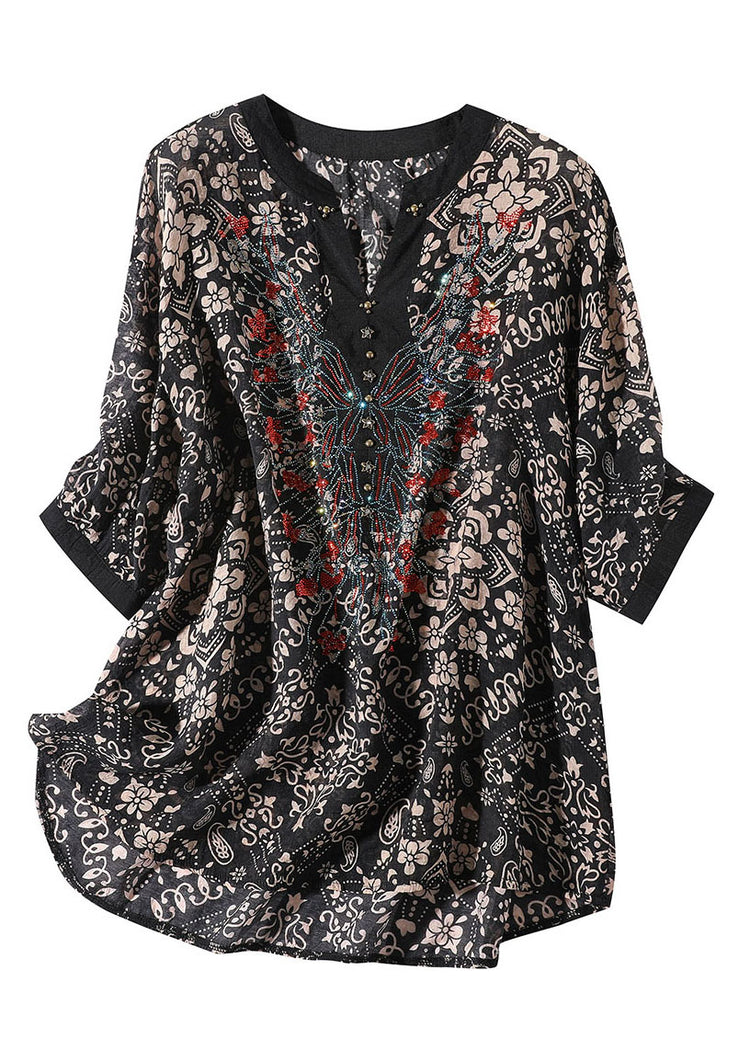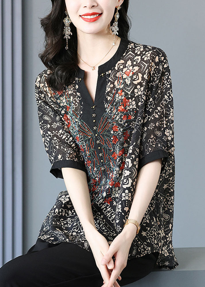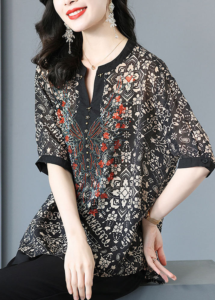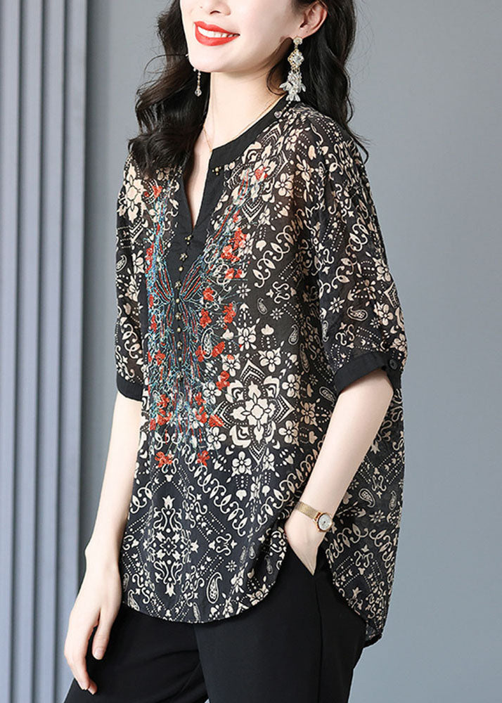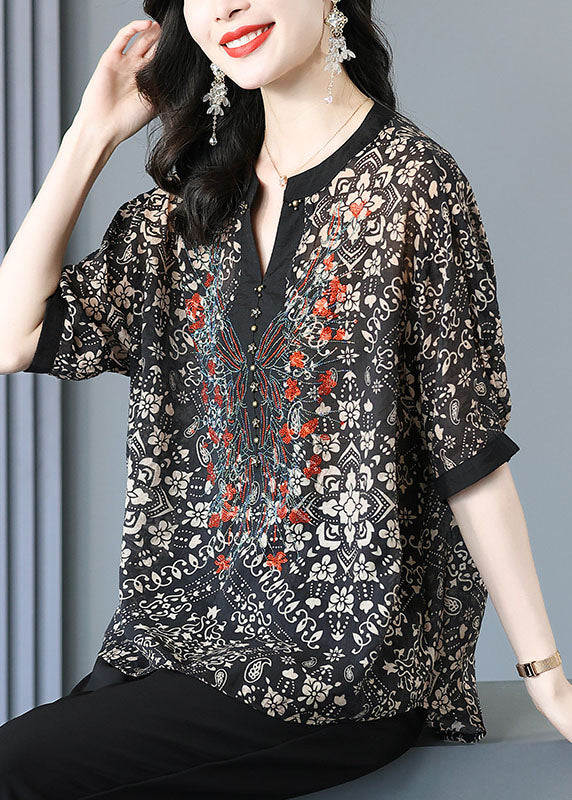 Elegant Black V Neck Print Silk Shirt For Women Short Sleeve