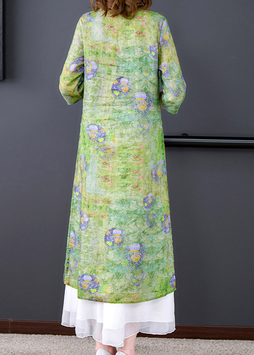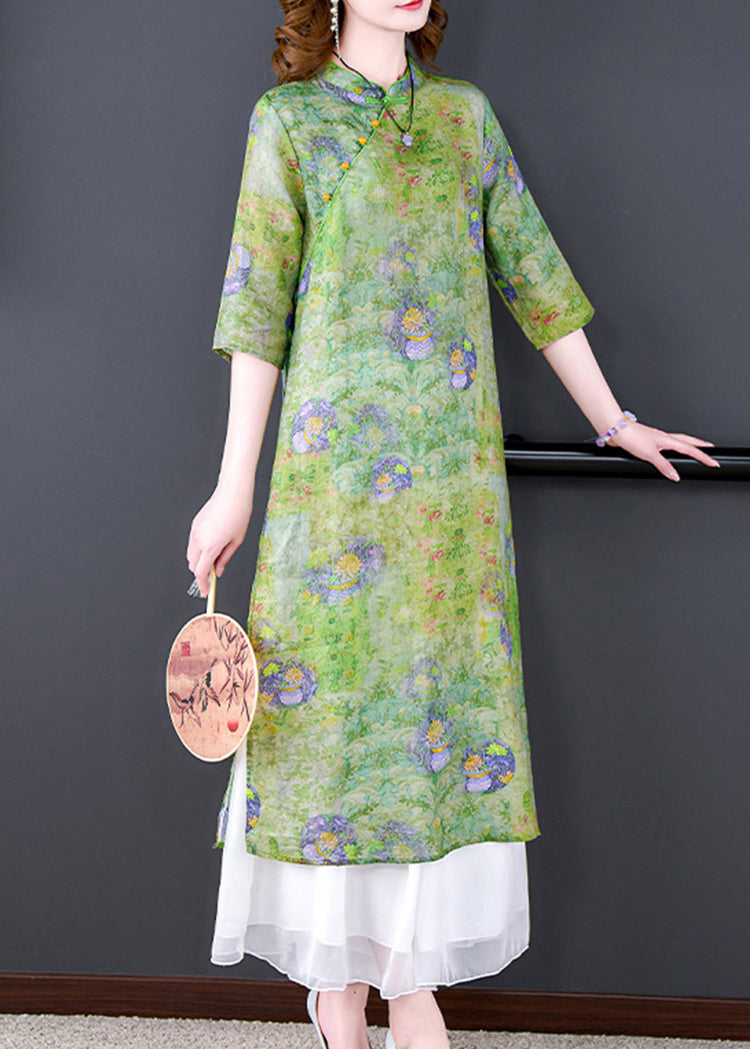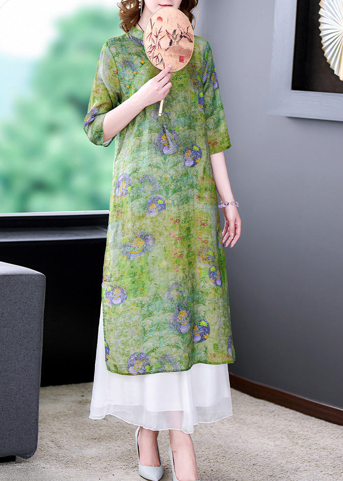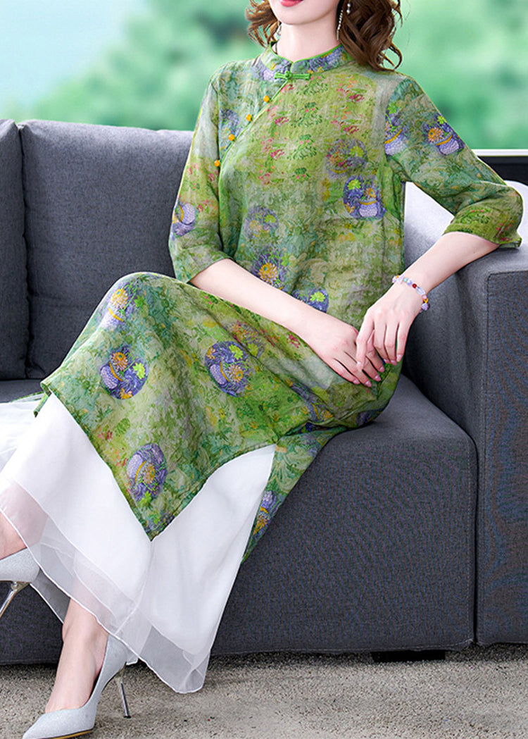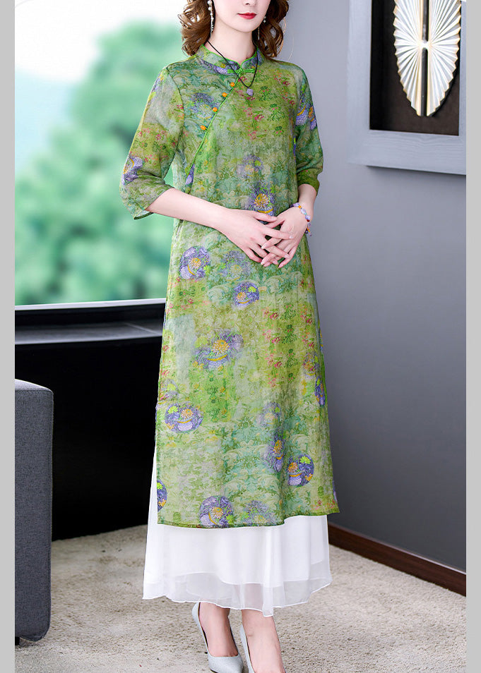 Elegant Green Stand Collar Print Side Open Button Silk Long Dresses Summer