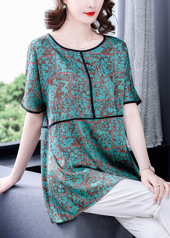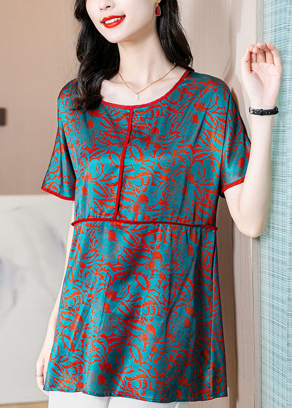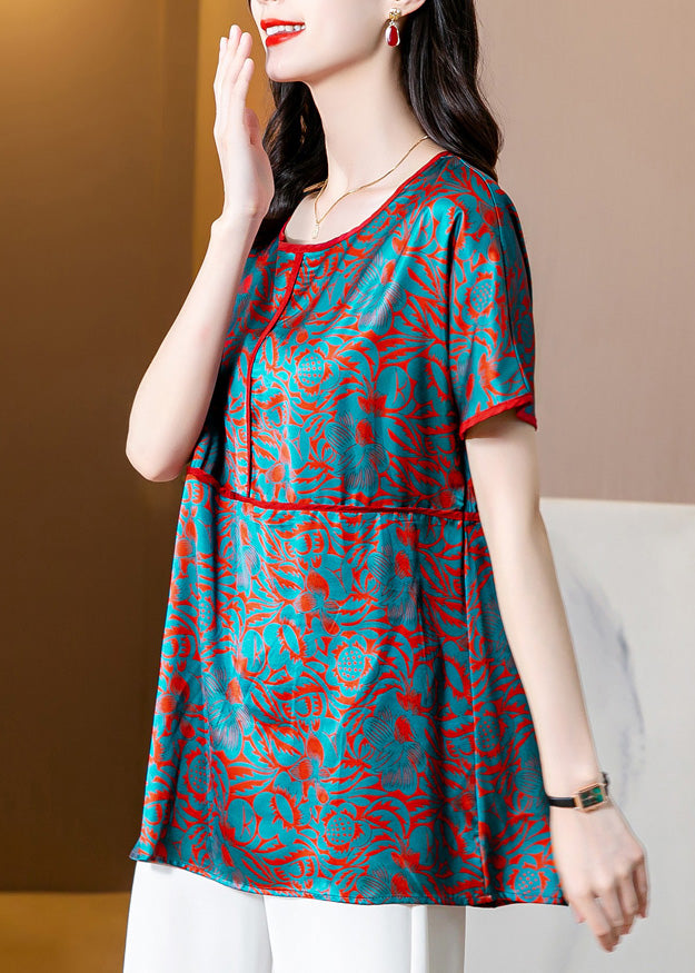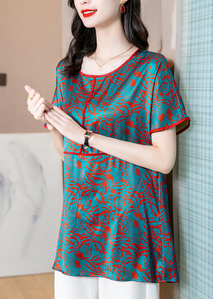 Fitted Blue Print Patchwork Silk Top Short Sleeve