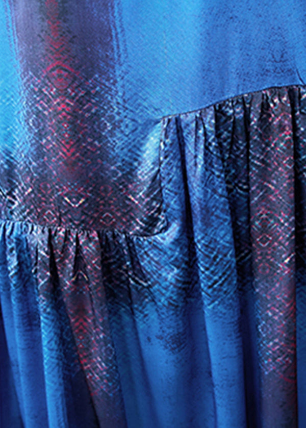 French Blue O-Neck Wrinkled Silk Holiday Dress Short Sleeve