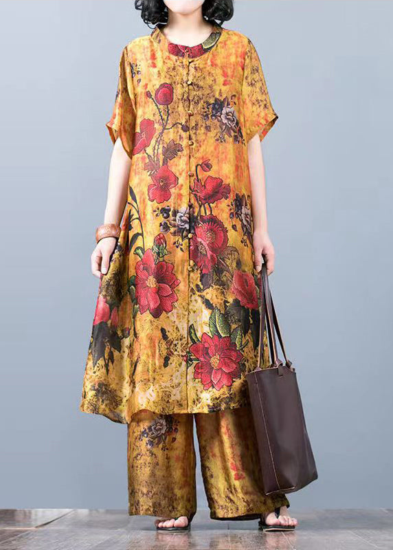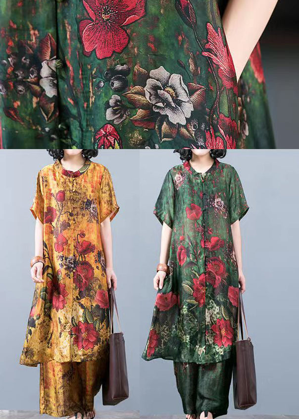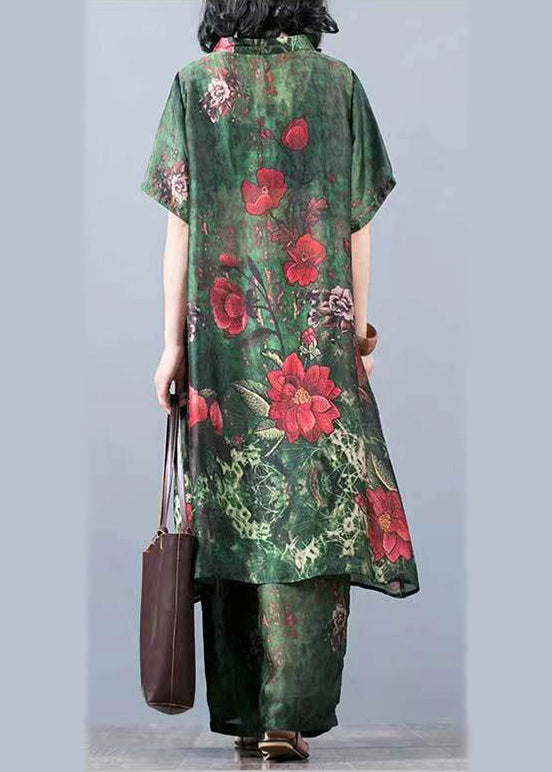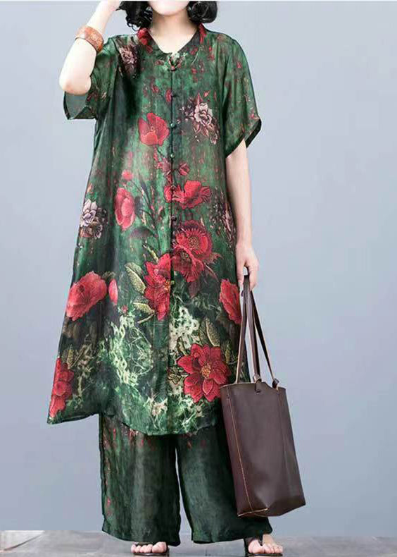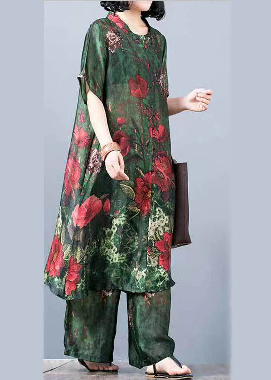 French Green Stand Collar Print Silk Dress And Wide Leg Pants Two Pieces Set Summer