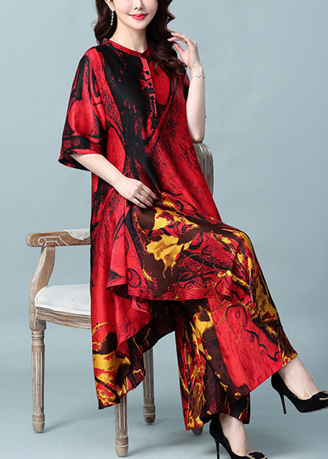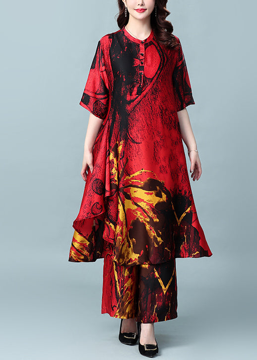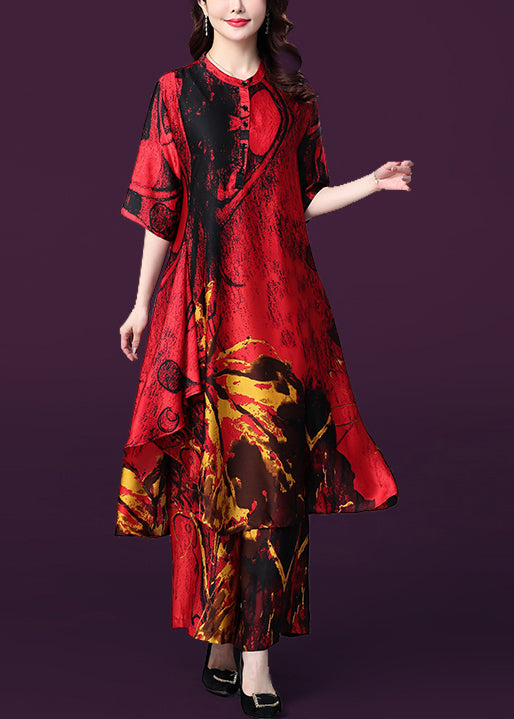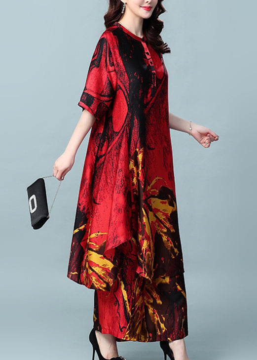French Red Asymmetrical Design Print Silk Dress And Wide Leg Pants Two Pieces Set Summer