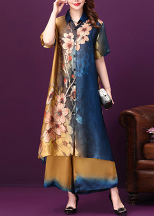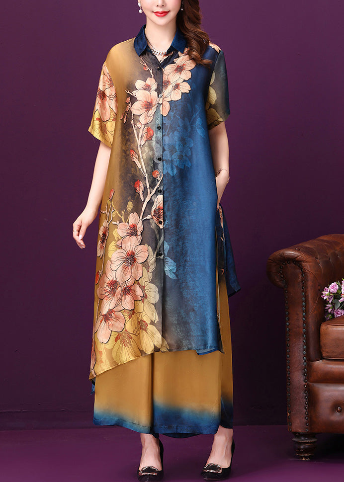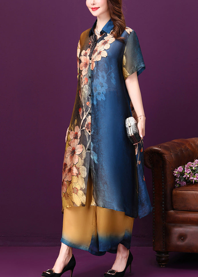 Gradient Color Blue Side Open Button Silk Long Shirts And Wide Leg Pants Half Sleeve