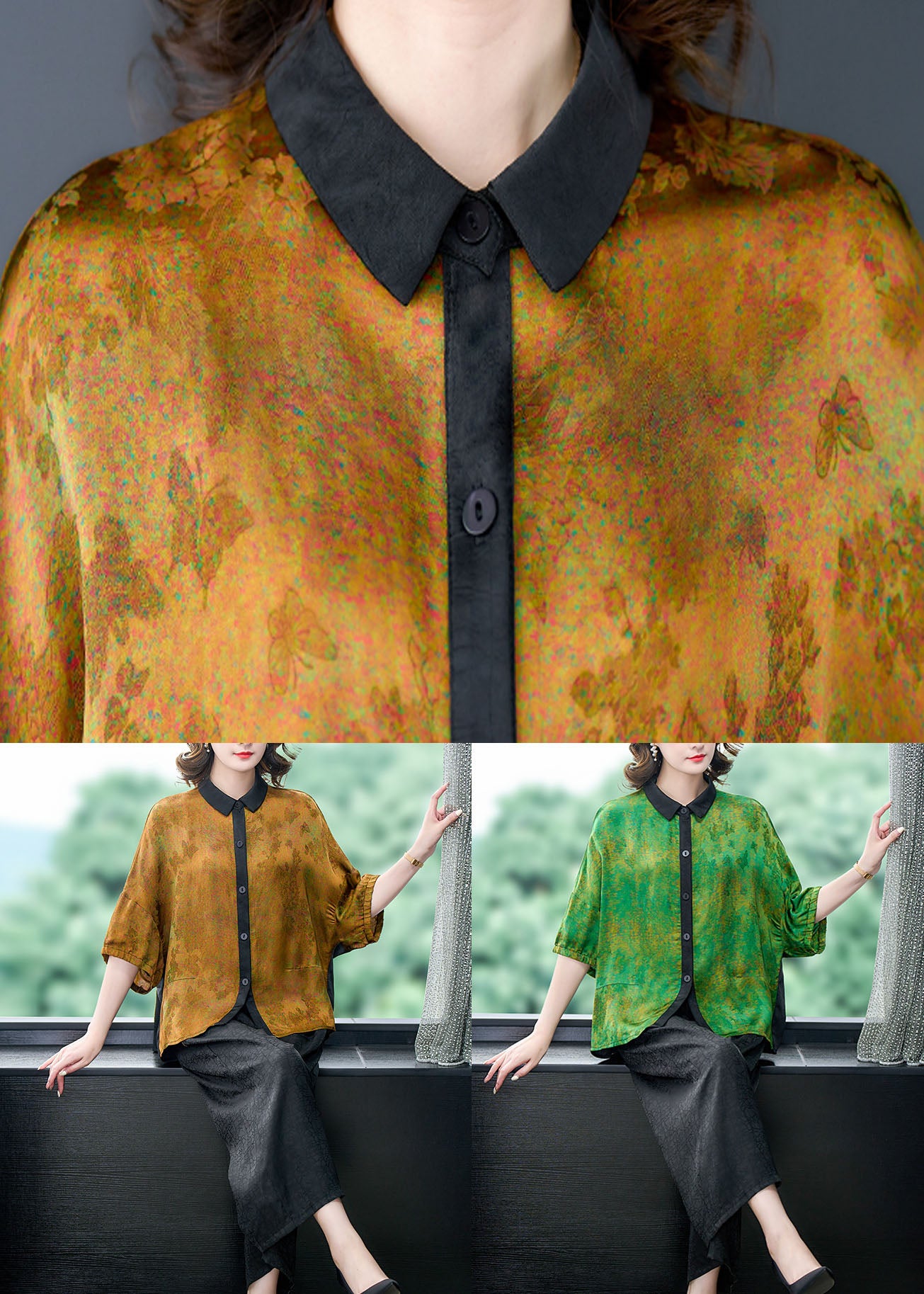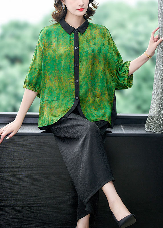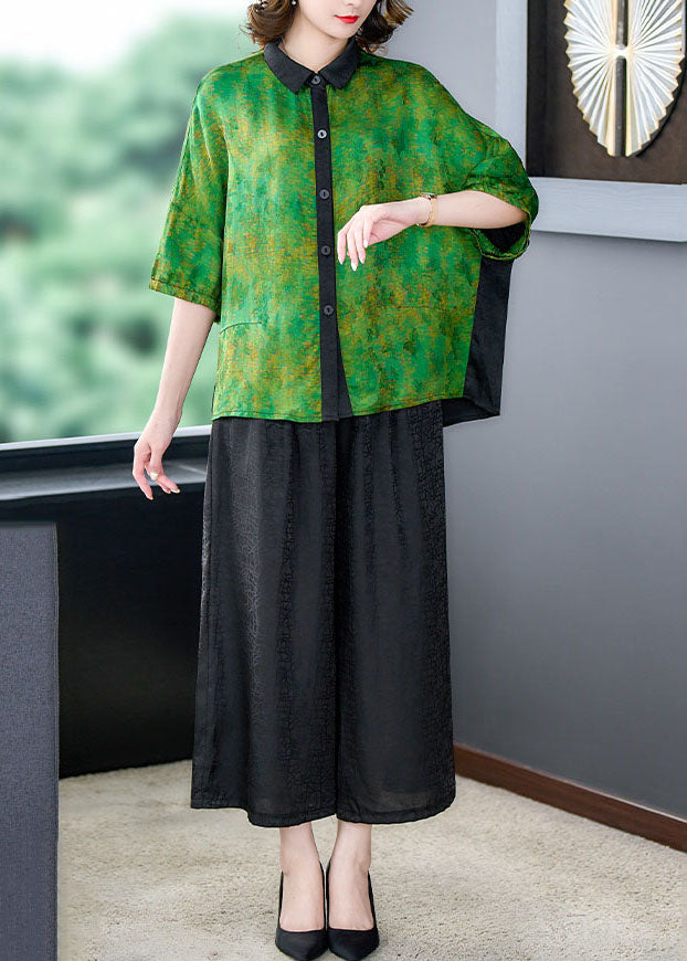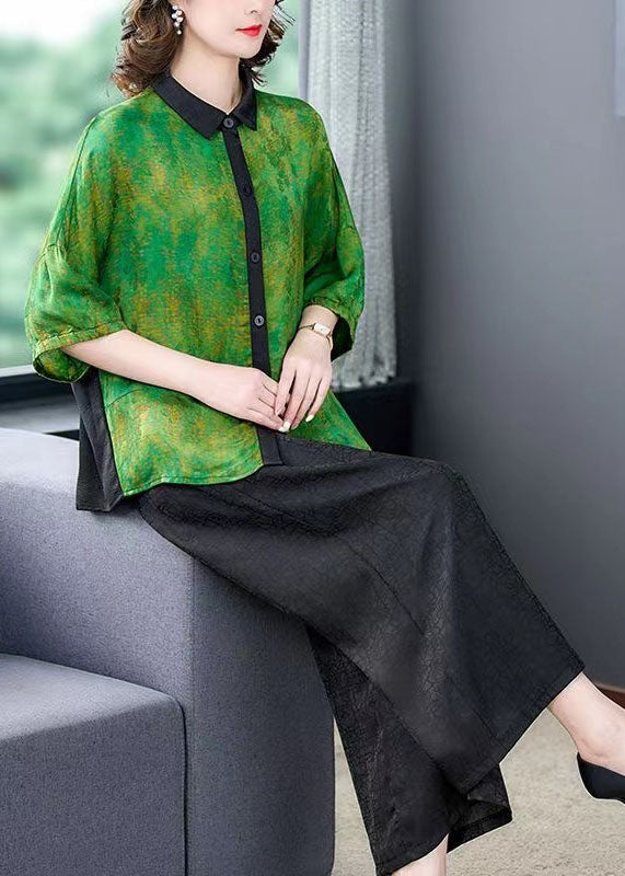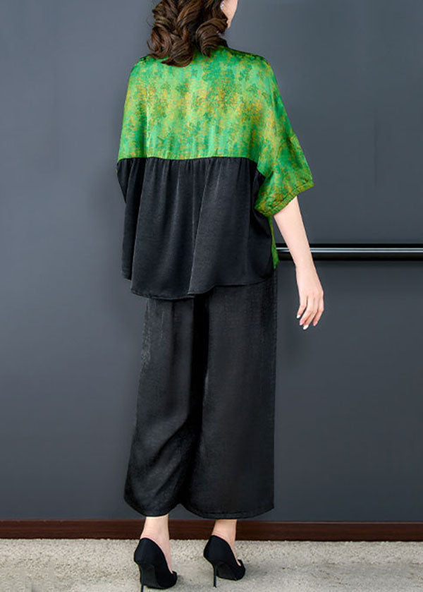 Green Print Patchwork Silk 2 Piece Outfit Shirts Tops And Pants Summer