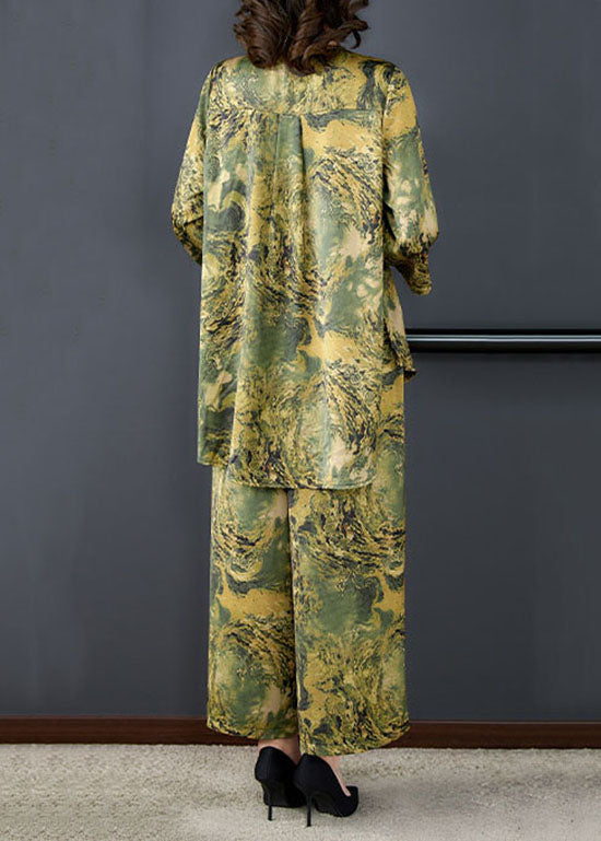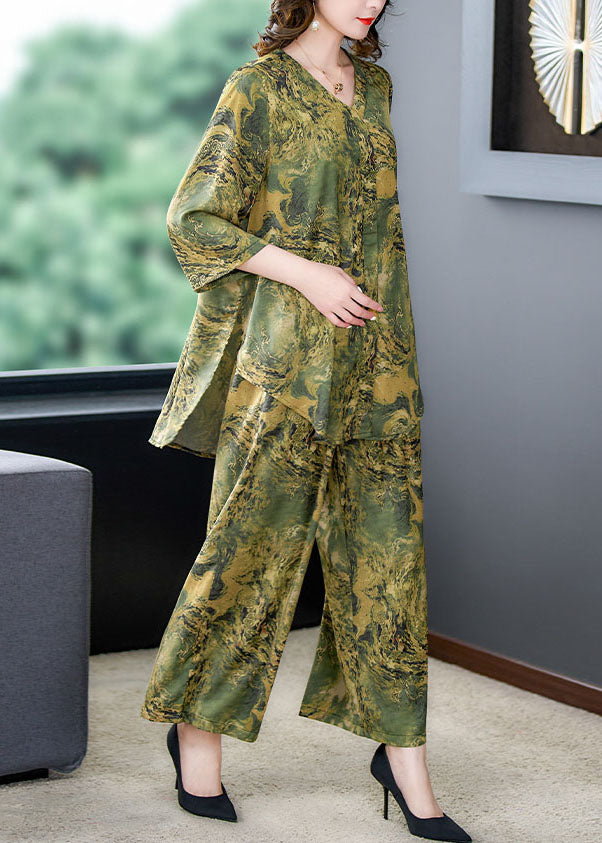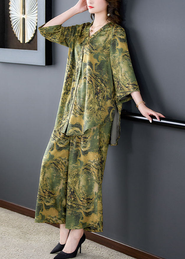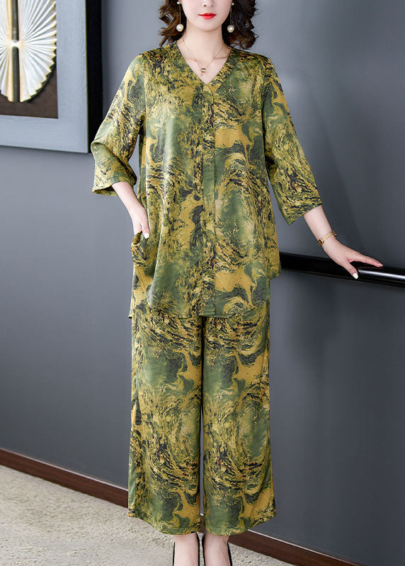 Green Print Pockets Silk Women Sets 2 Pieces Tops And Pants V Neck Summer