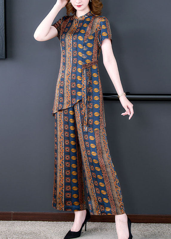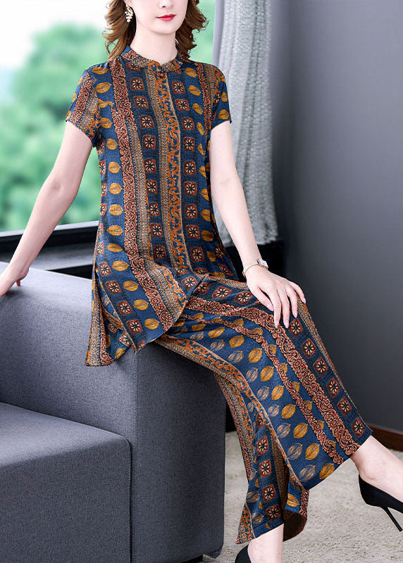 Italian Floral Stand Collar Tops And Pants Patchwork Silk Two Pieces Set Summer