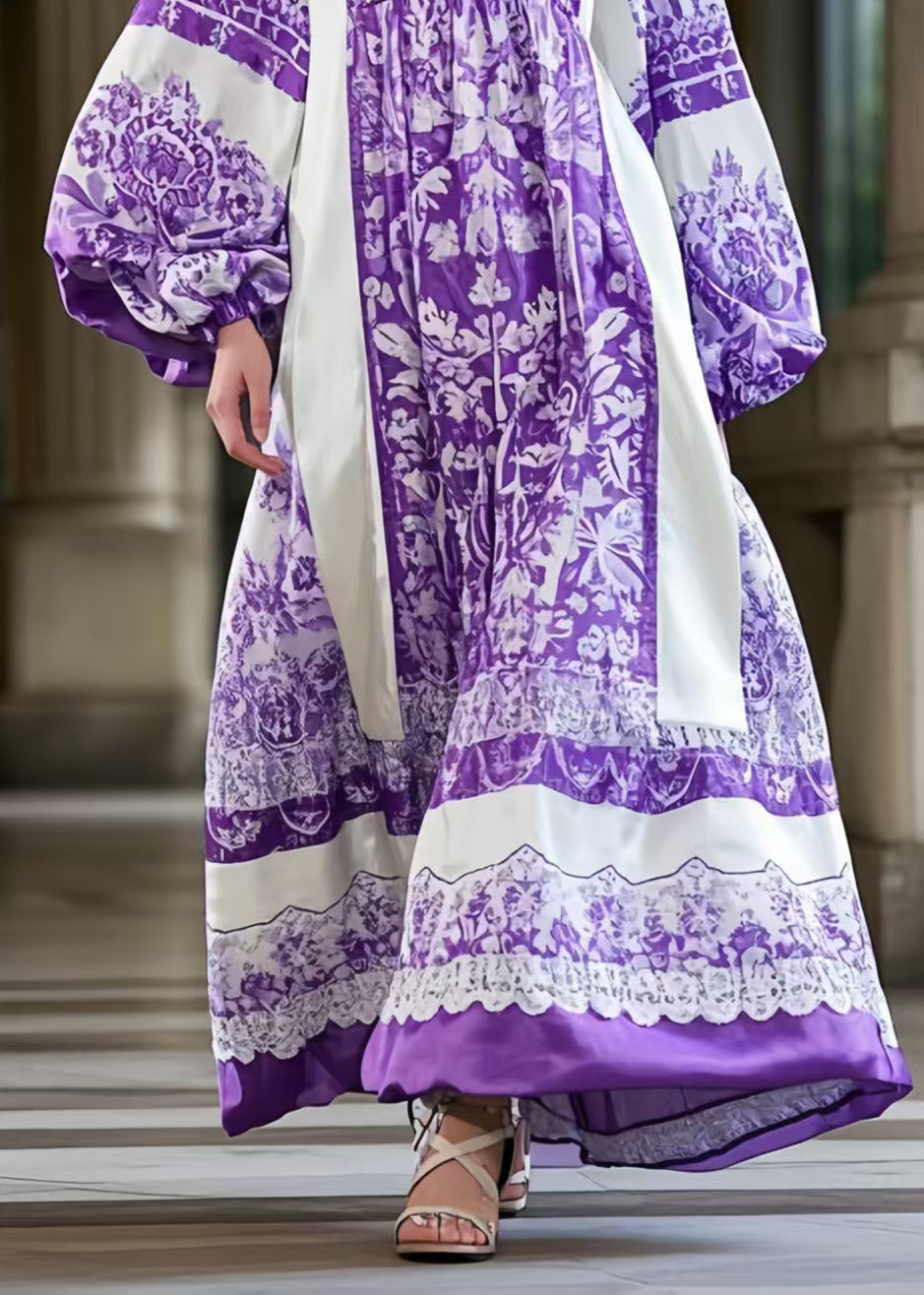 Italian Purple Oversized Print Silk Vacation Dresses Lantern Sleeve