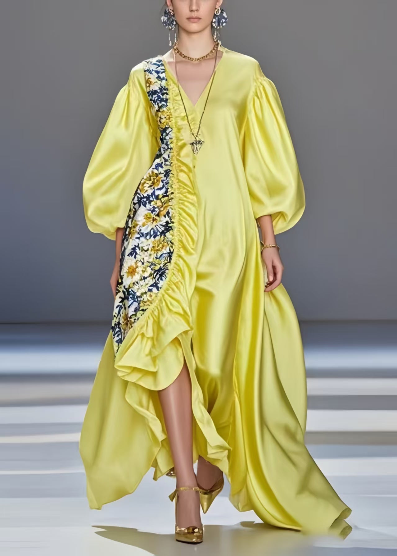 Modern Yellow Asymmetrical Patchwork Silk Vestidos Dresses Lantern Sleeve