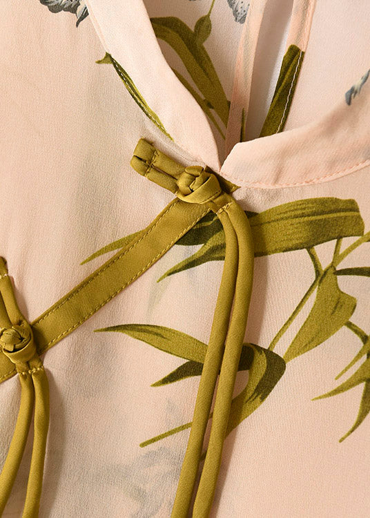 Natural Apricot Pink Stand Collar Print Button Silk Shirts Long Sleeve