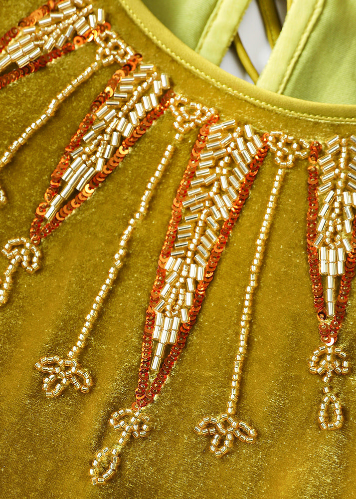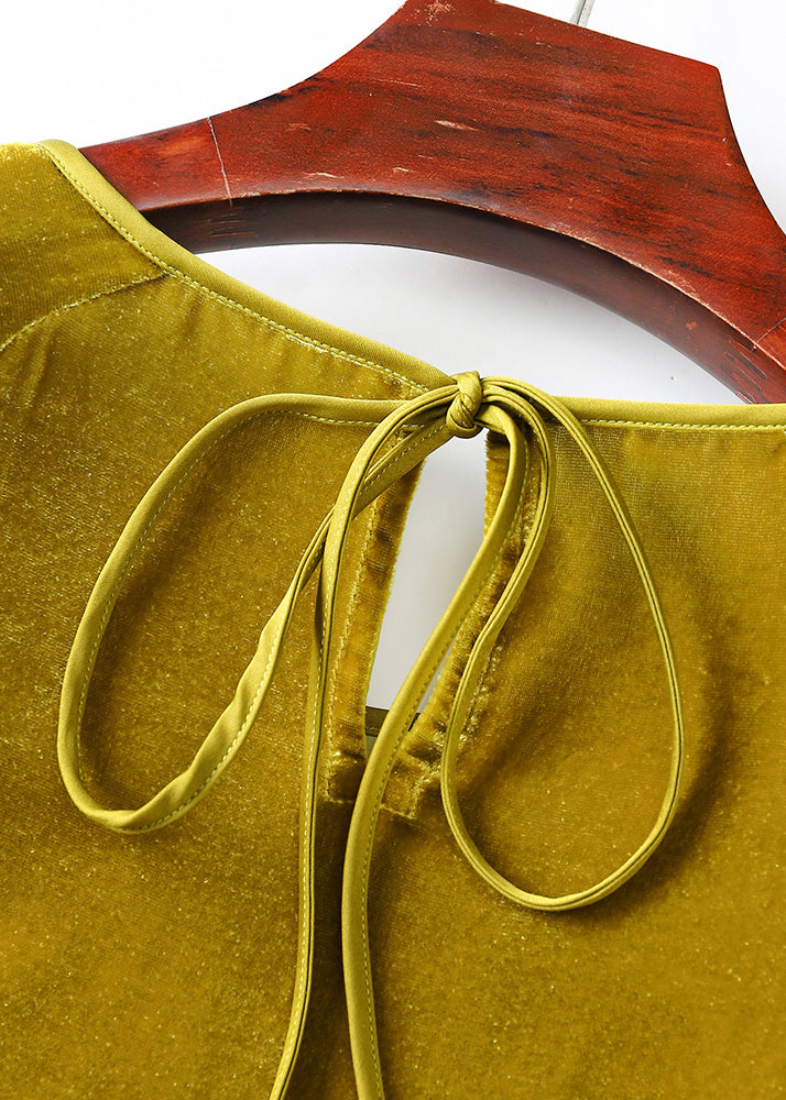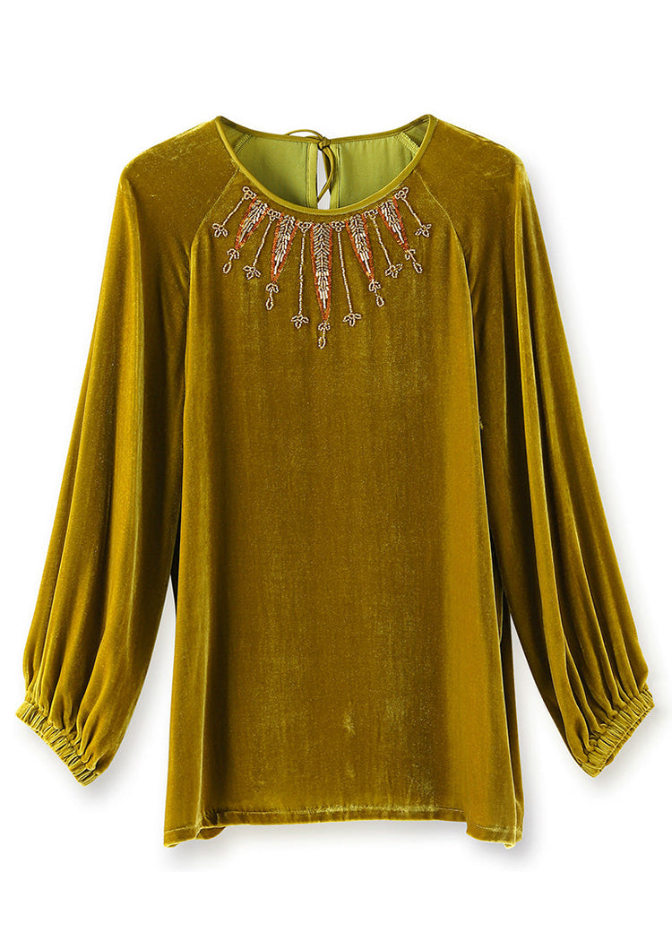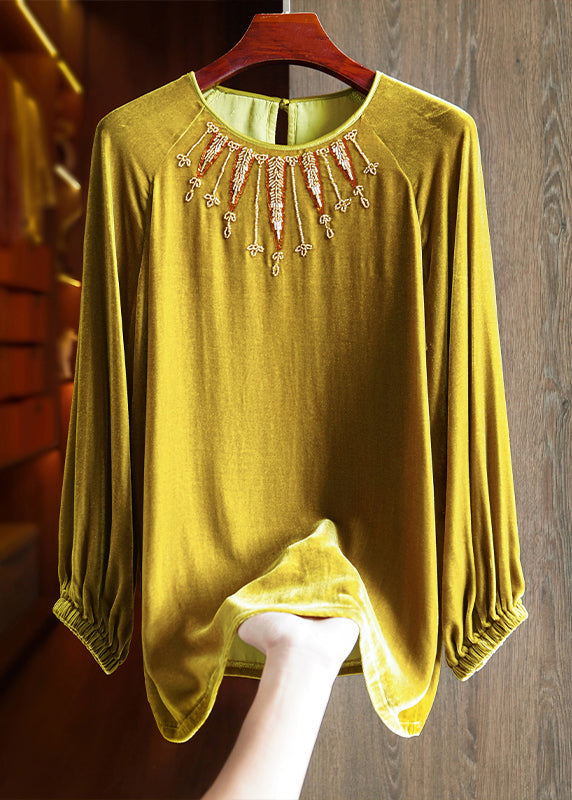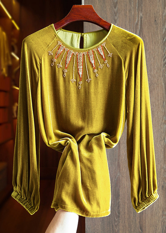 New Yellow O Neck Nail Bead Patchwork Silk Velour Top Fall
