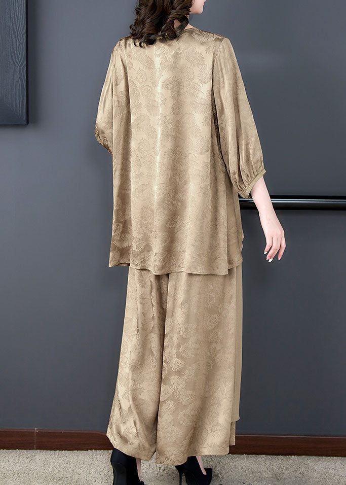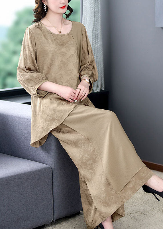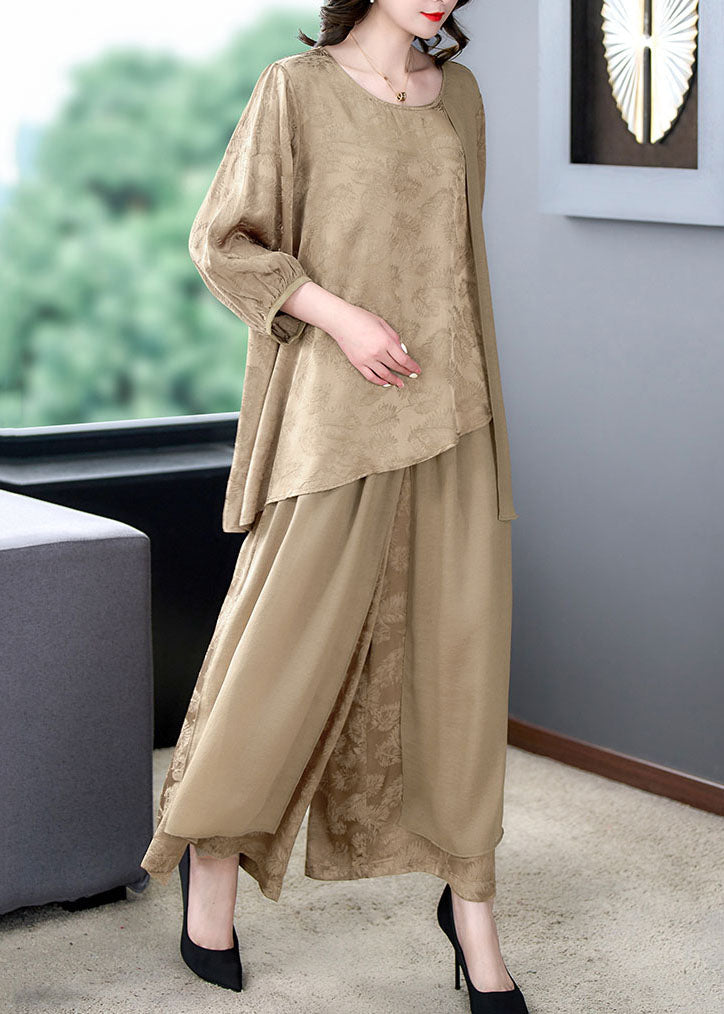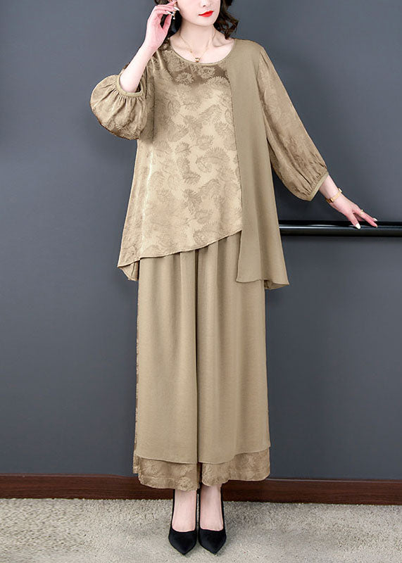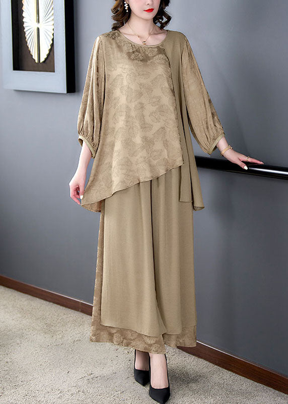 Oversized Khaki Print Asymmetrical Patchwork Silk Two Pieces Set Summer