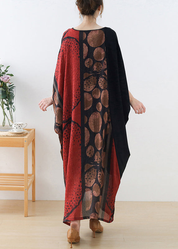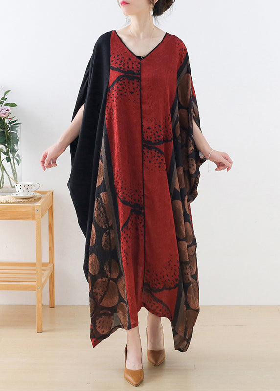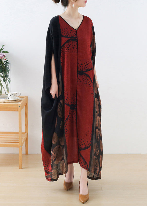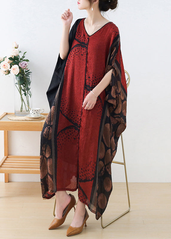 Plus Size Red V Neck Patchwork Silk Long Dress Batwing Sleeve