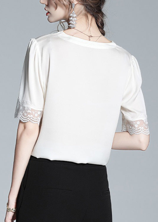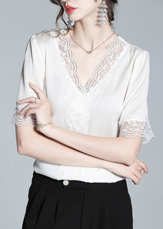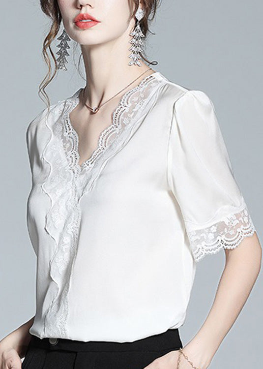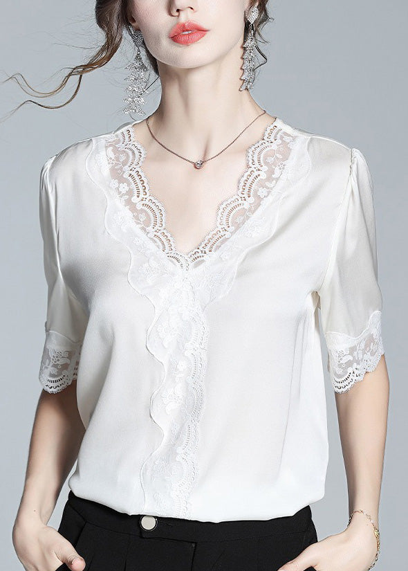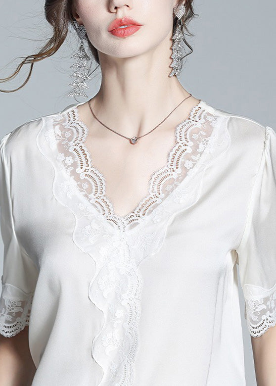 Plus Size White V Neck Lace Patchwork Silk Top Summer