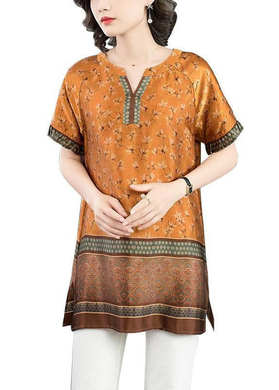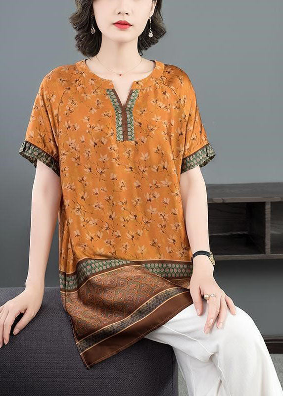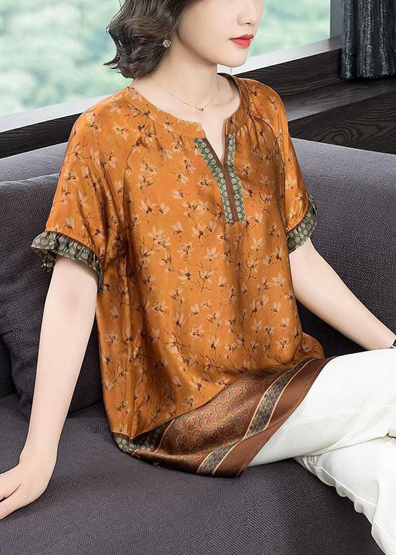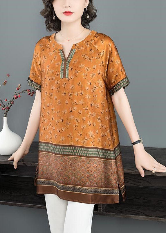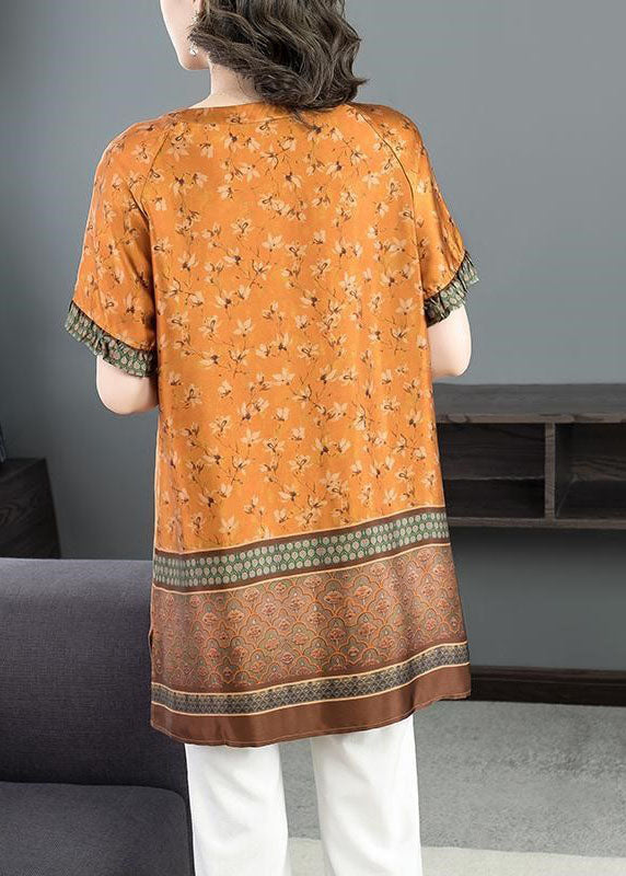 Plus Size Yellow V Neck Print Patchwork Ruffled Silk Tops Short Sleeve