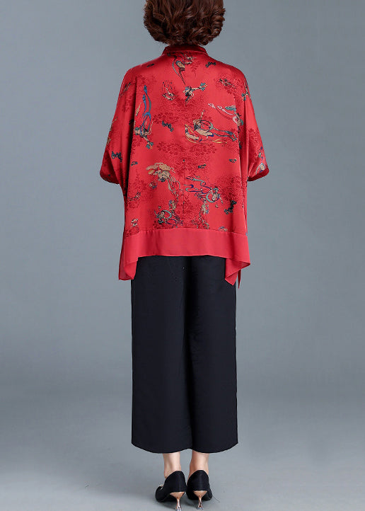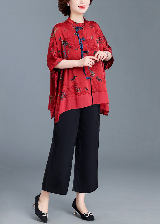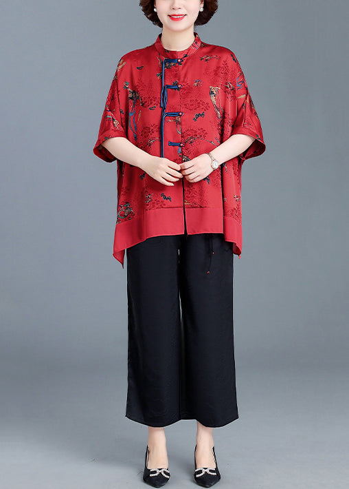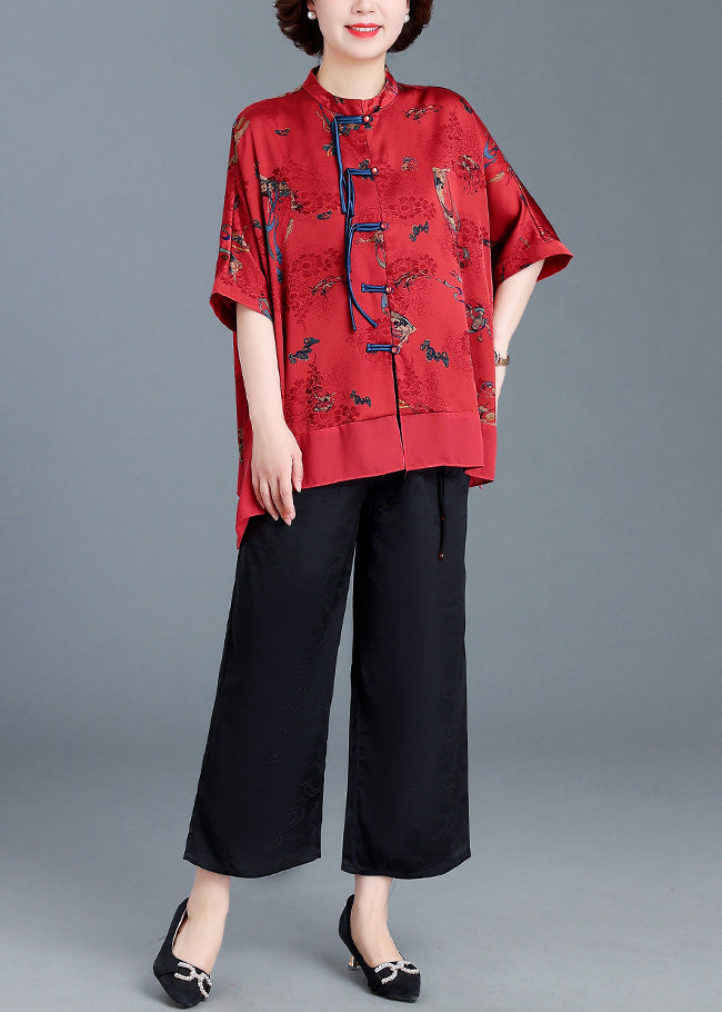 Red Print Button Patchwork Silk Two Piece Set Stand Collar Summer