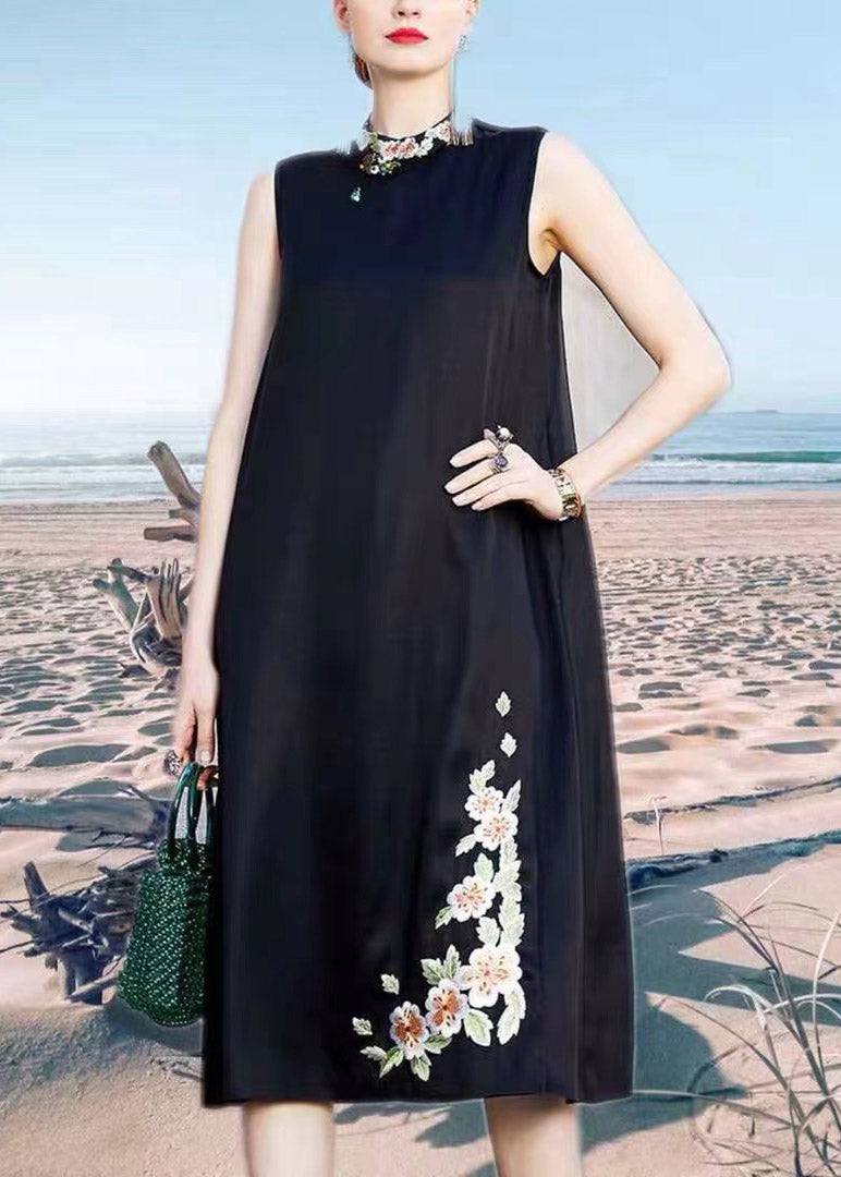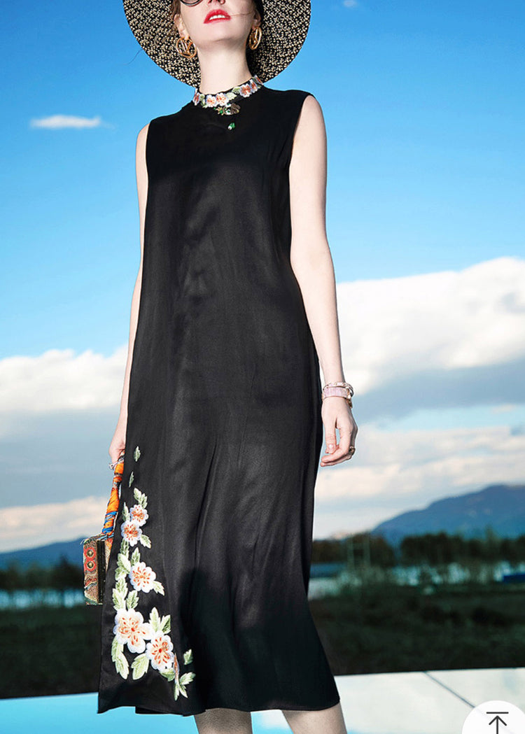 Simple Black O-Neck Embroideried Silk Long Dress Summer