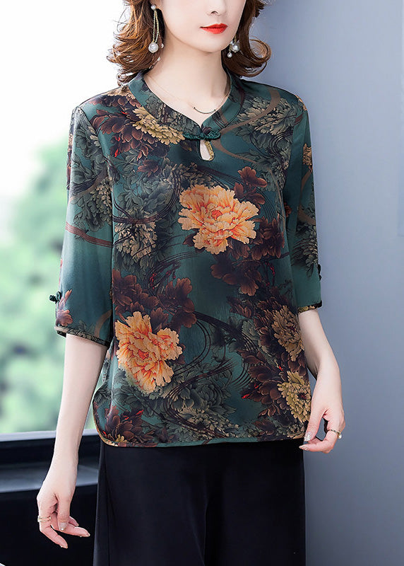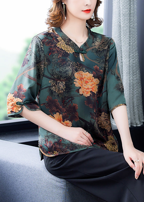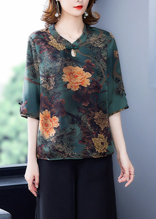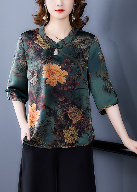 Simple Green O-Neck Print Button Silk Top Half Sleeve
