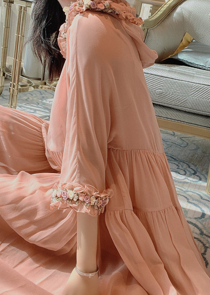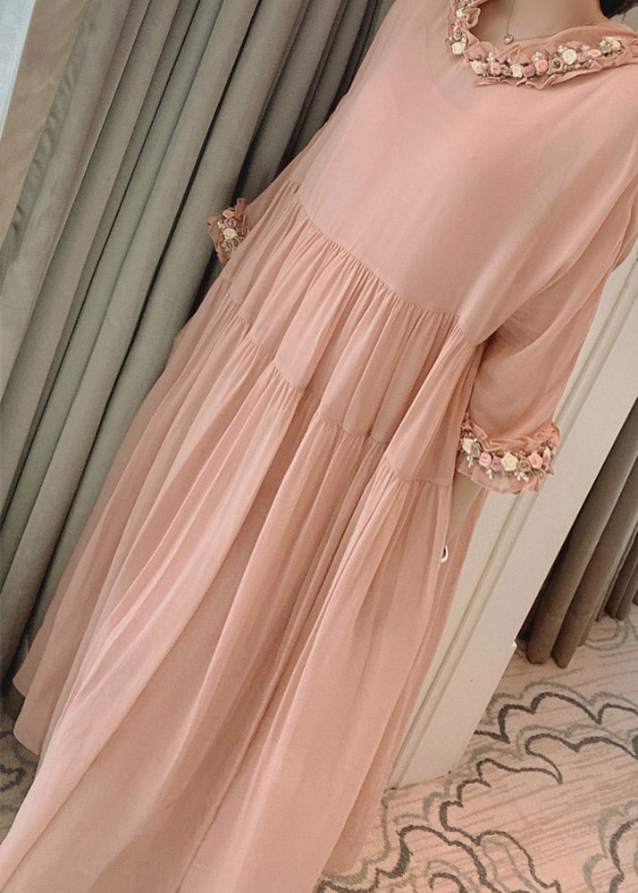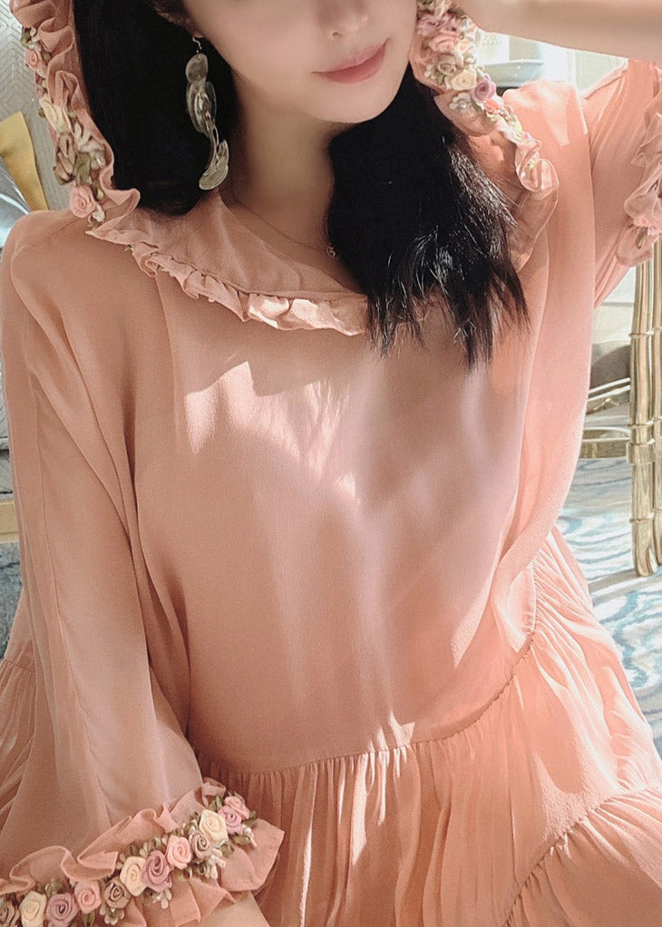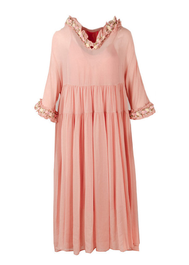 Simple Pink Floral Wrinkled Hoold Silk Maxi Dresses Flare Sleeve