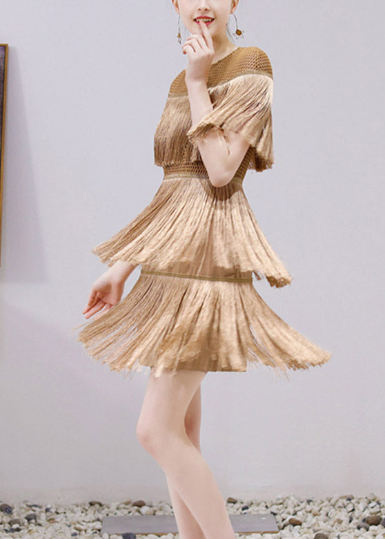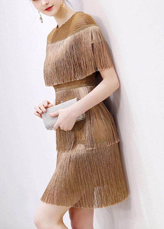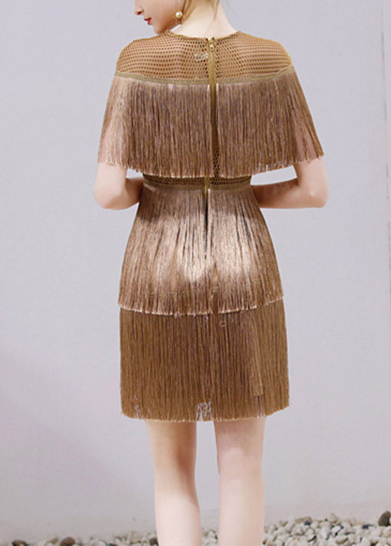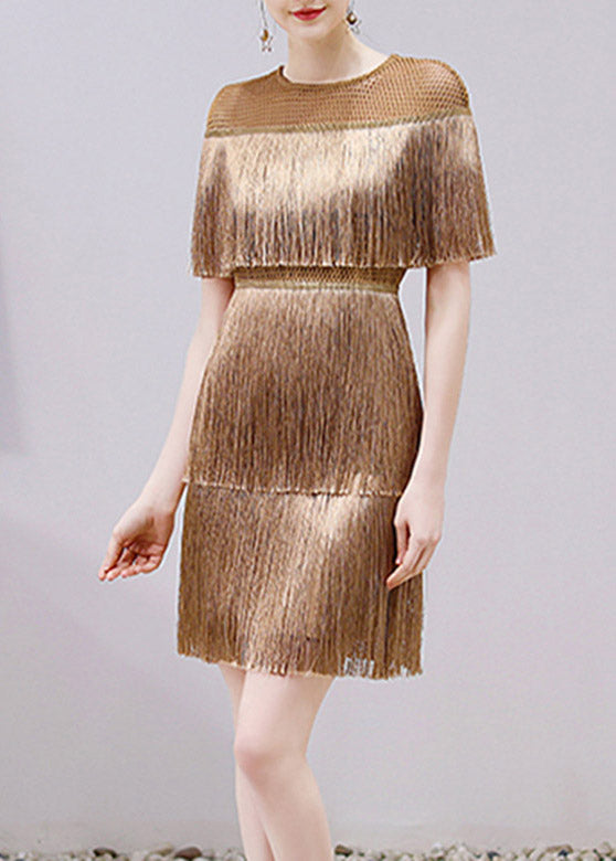 Slim Fit Gold O-Neck Tassel Silk Mid Dress Short Sleeve