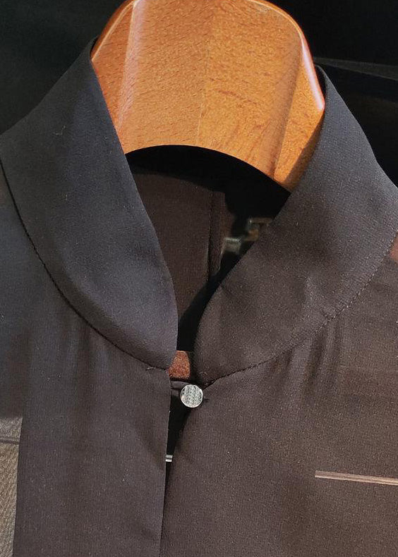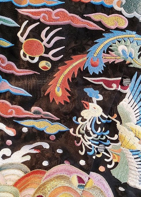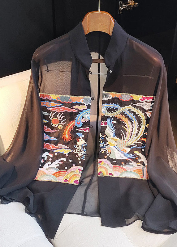 Women Black Stand Collar Embroideried Floral Silk Shirts Long Sleeve