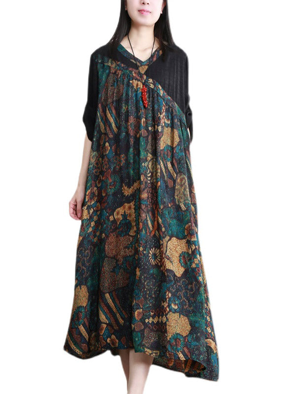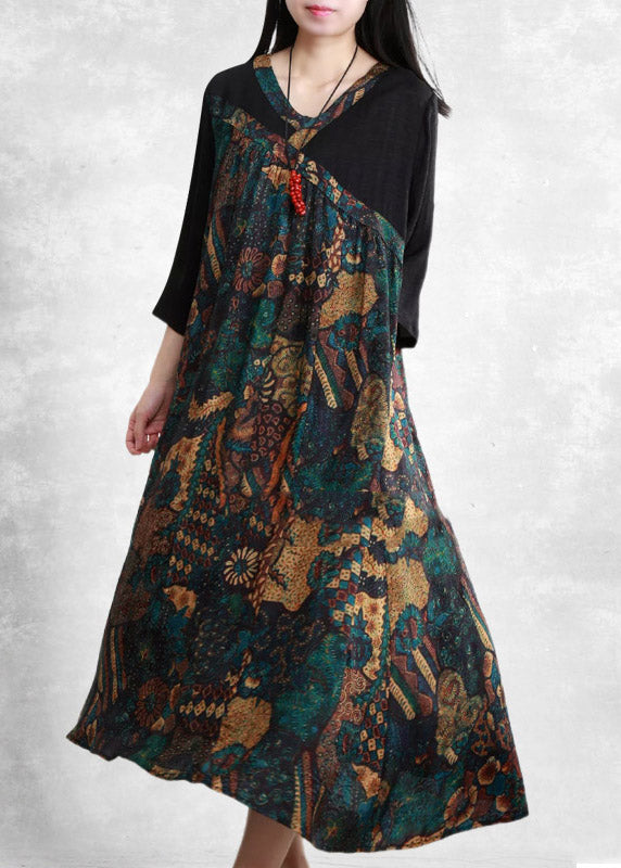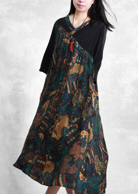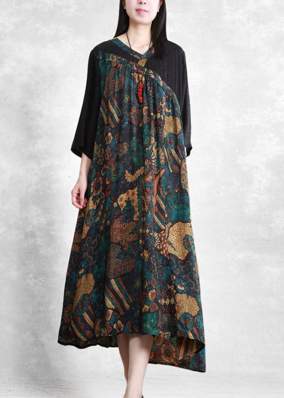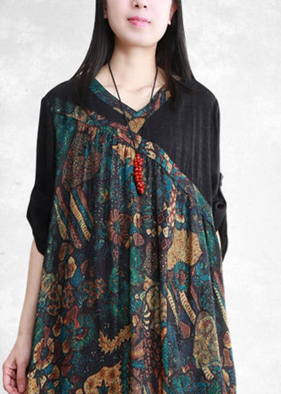 Women Black V Neck Patchwork Asymmetrical Print Silk Dress Three Quarter Sleeve