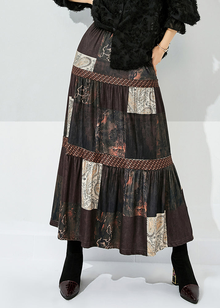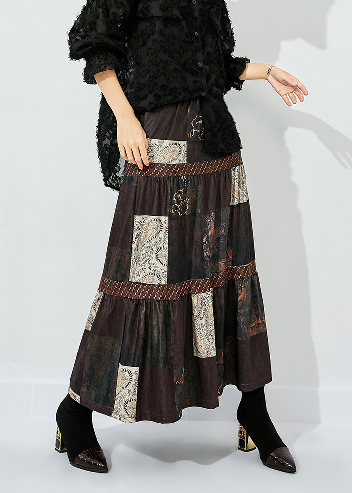 Women Brown Print Patchwork Wrinkled Silk Skirts Summer