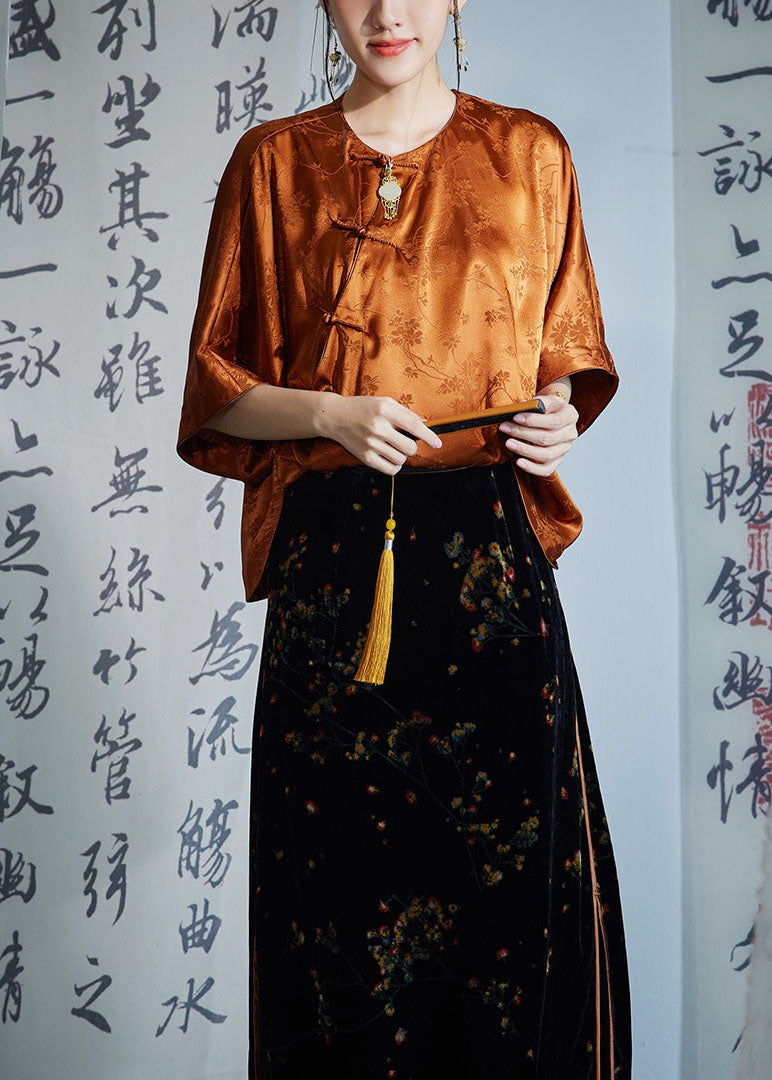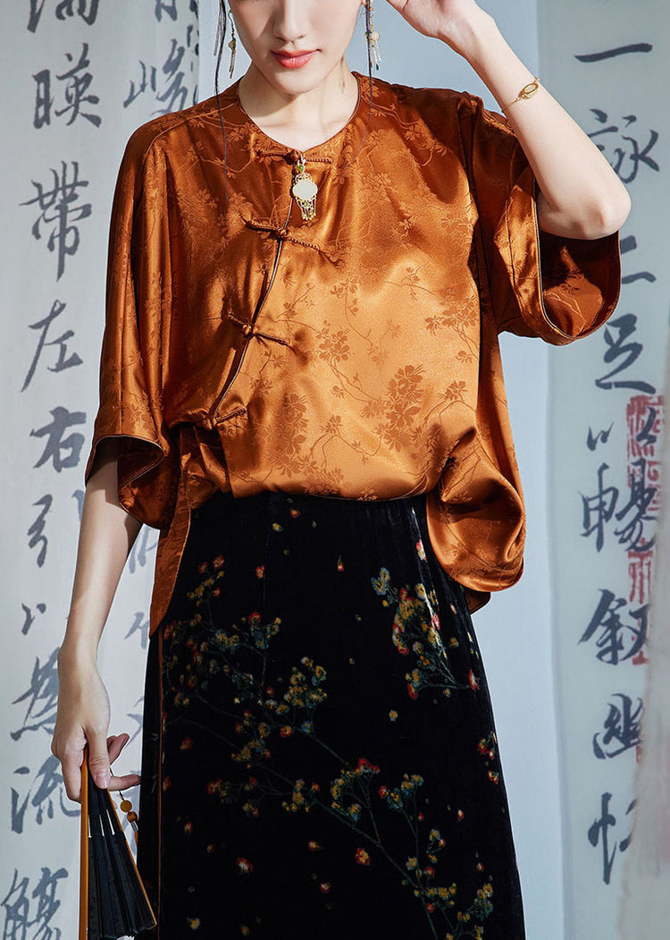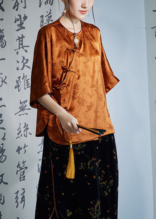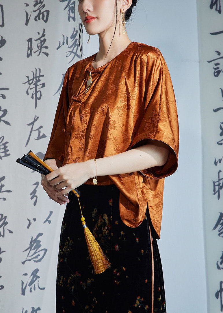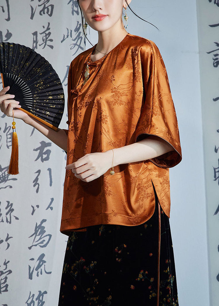 Women Caramel O-Neck Oriental Button Side Open Jacquard Silk Shirt Half Sleeve