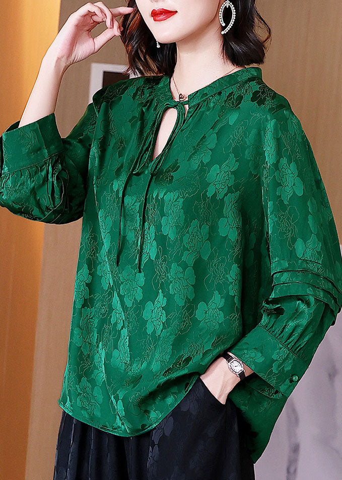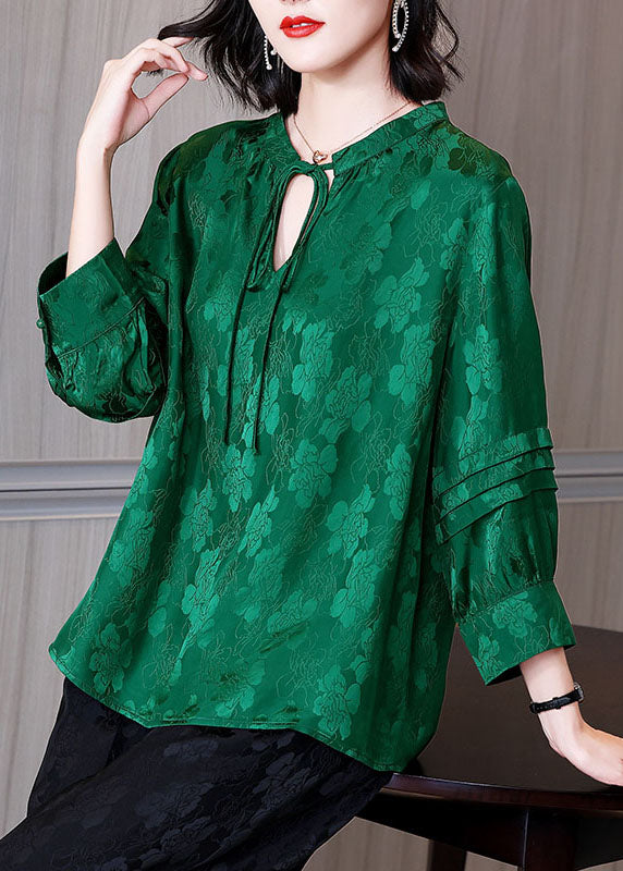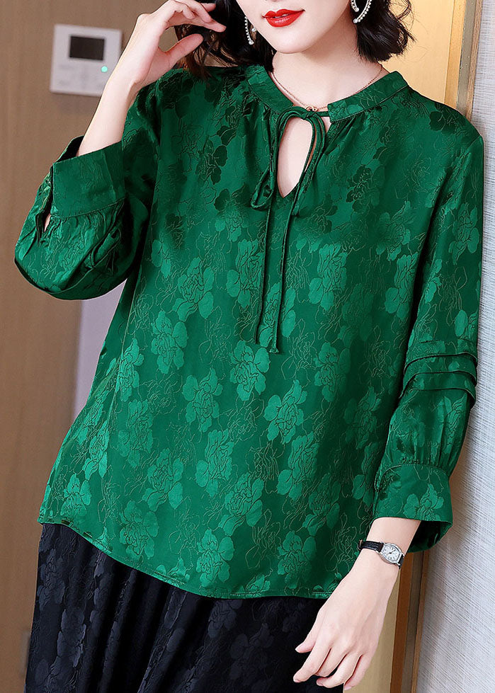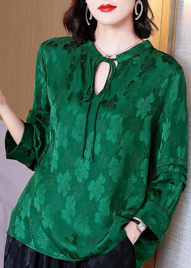 Women Green Lace Up Jacquard Patchwork Silk Shirt Tops Fall