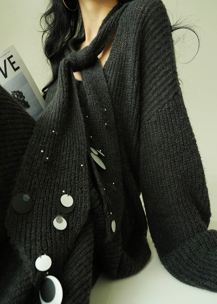 Loose Grey V Neck Sequins Knit Two Pieces Set Fall