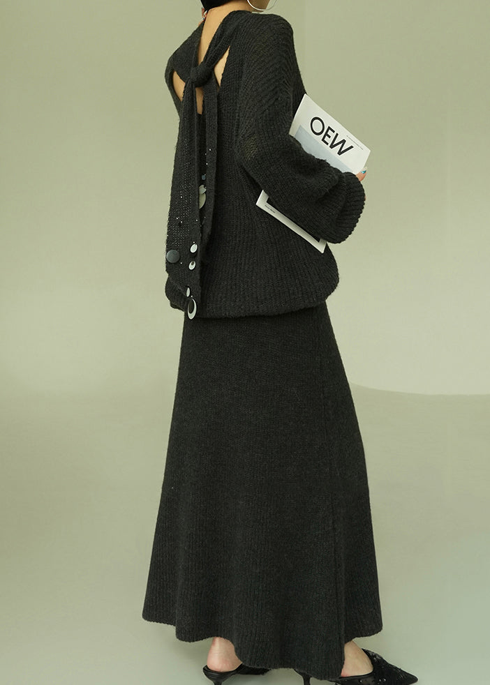 Fashion Grey High Neck Side Open Knit Two Pieces Set Winter
