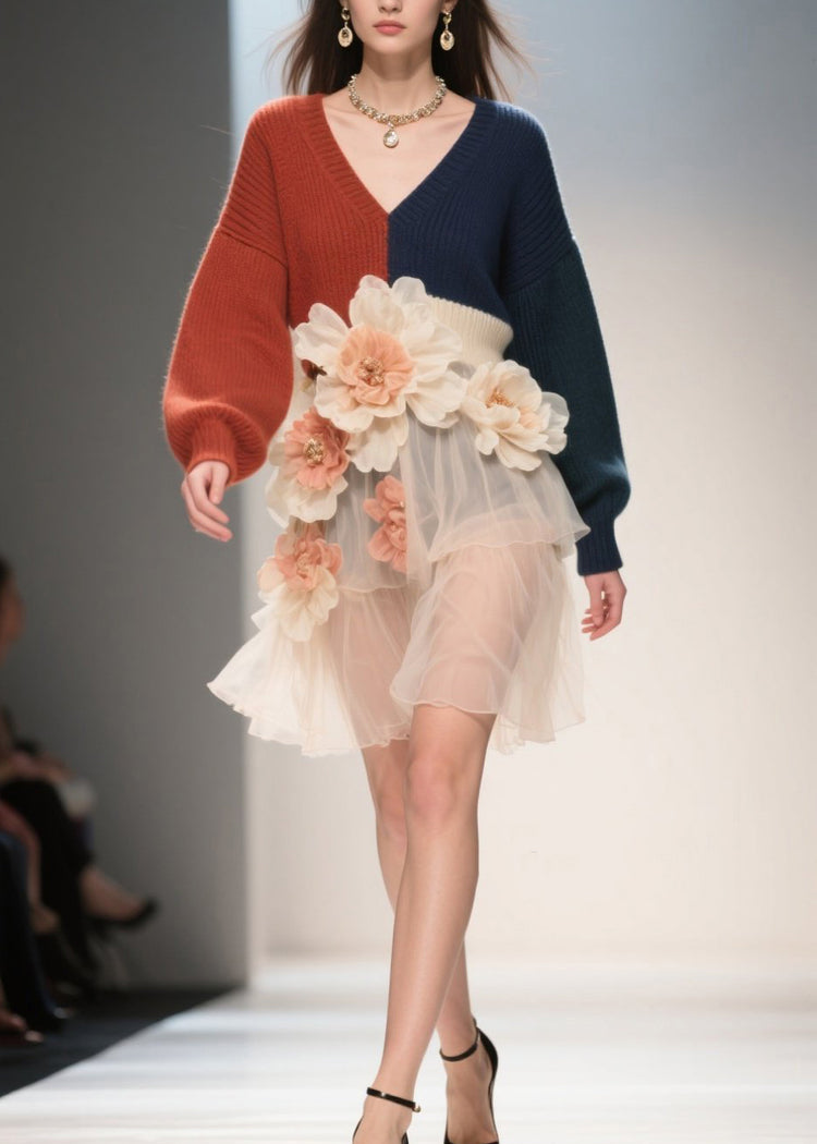 French Colorblock V Neck Tulle Floral Patchwork Knit Dress Fall
