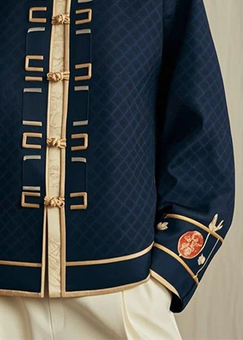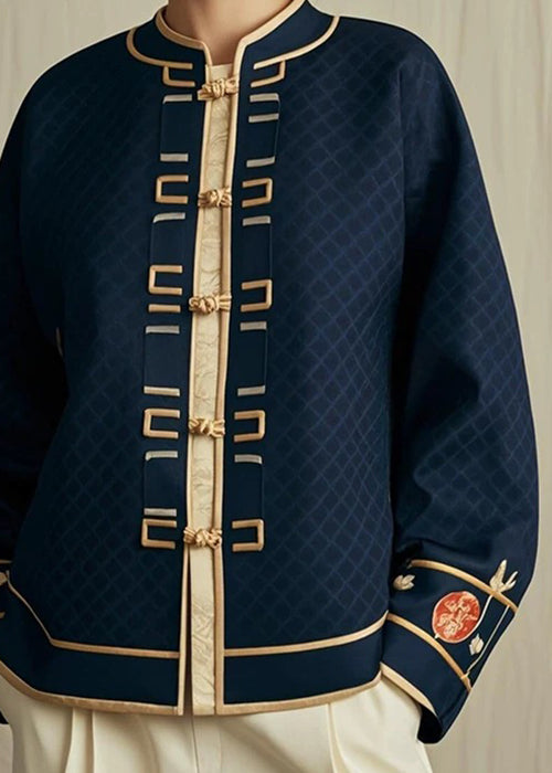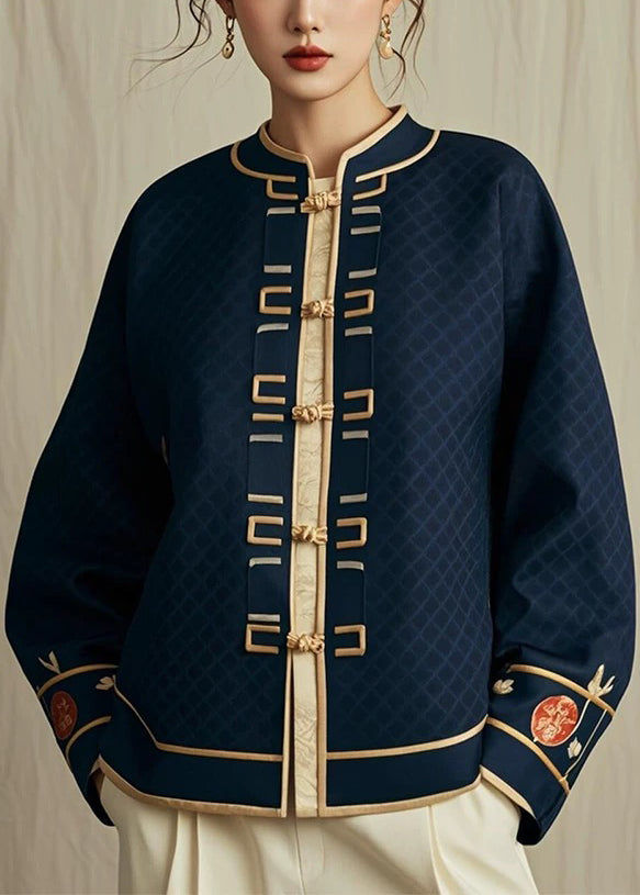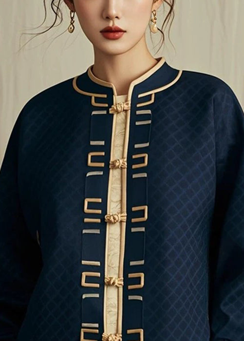 Classy Navy Stand Collar Plaid Button Coat Fall