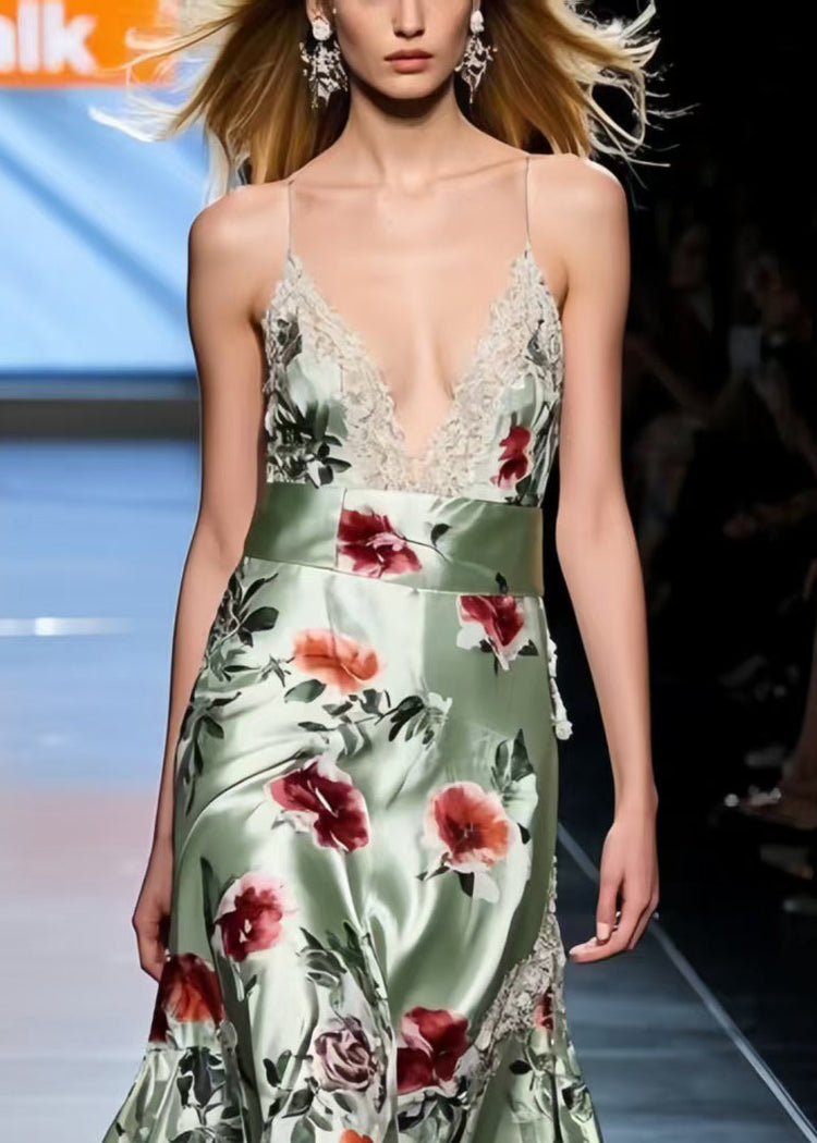 Green Floral Silk Vestidos Dresses Exra Large Hem Summer