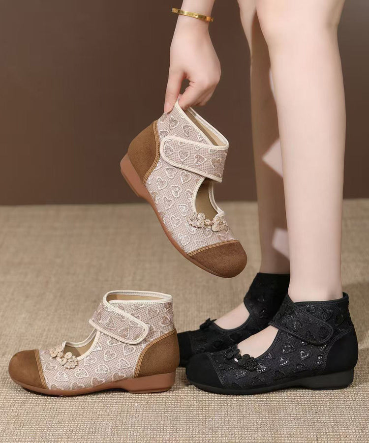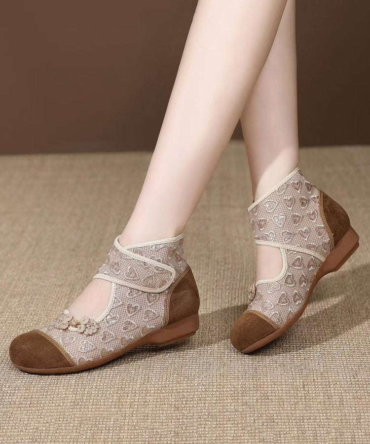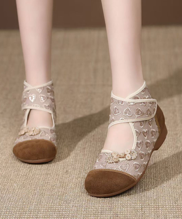 Beige Breathable Mesh Embroidered Buckle Strap Splicing Flat Shoes