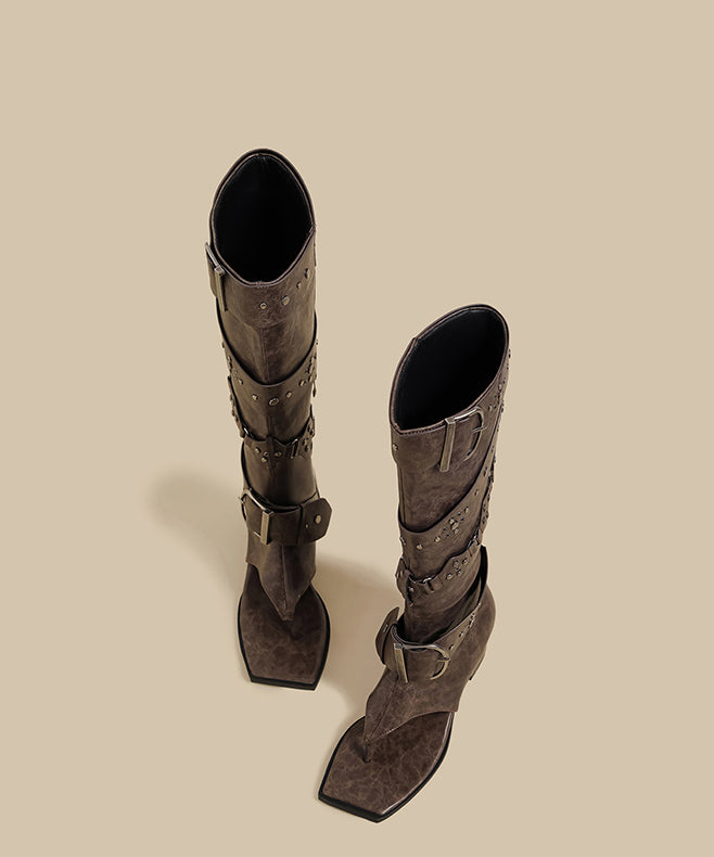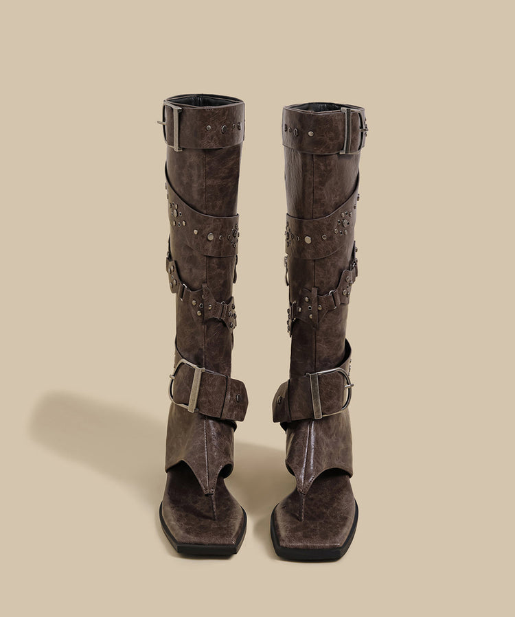 Unique Splicing Chunky Flip Flops Boots Black Faux Leather Rivet