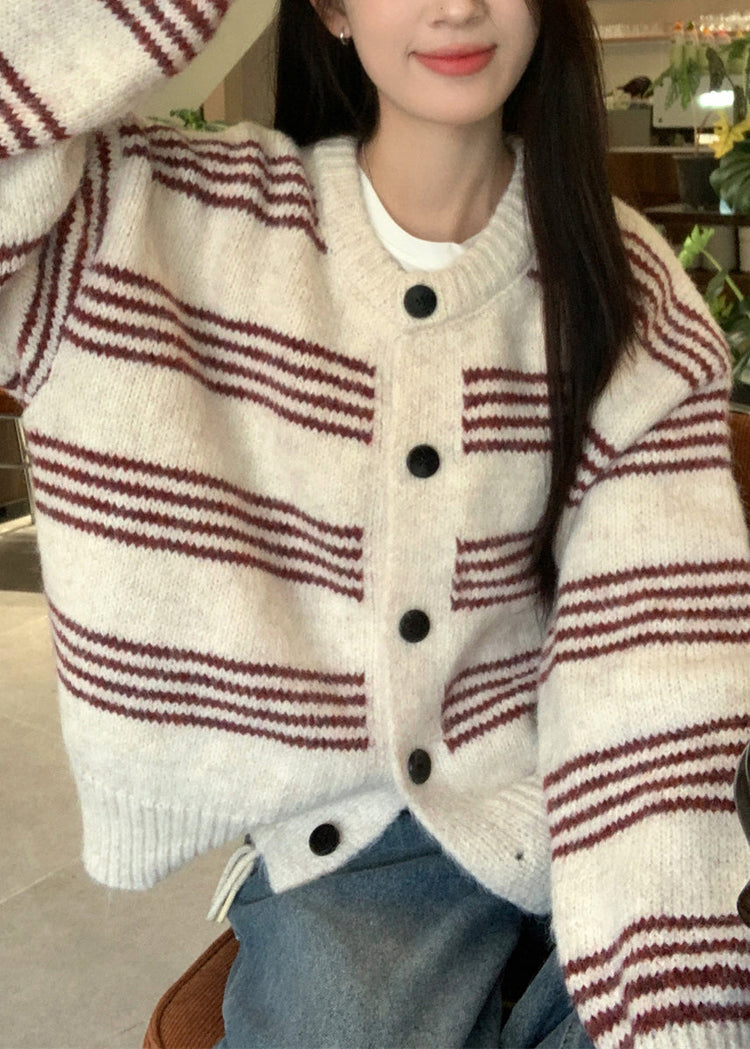 Natural Red Striped O-Neck Cotton Knit Cardigan Long Sleeve