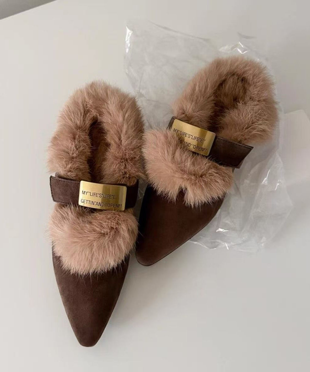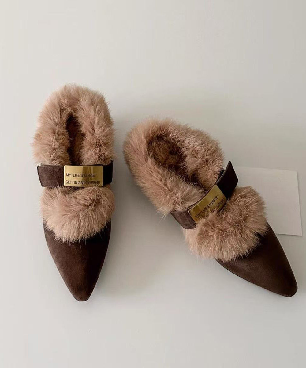 Brown Suede Splicing Chunky Heel Fuzzy Wool Lined Pointed Toe