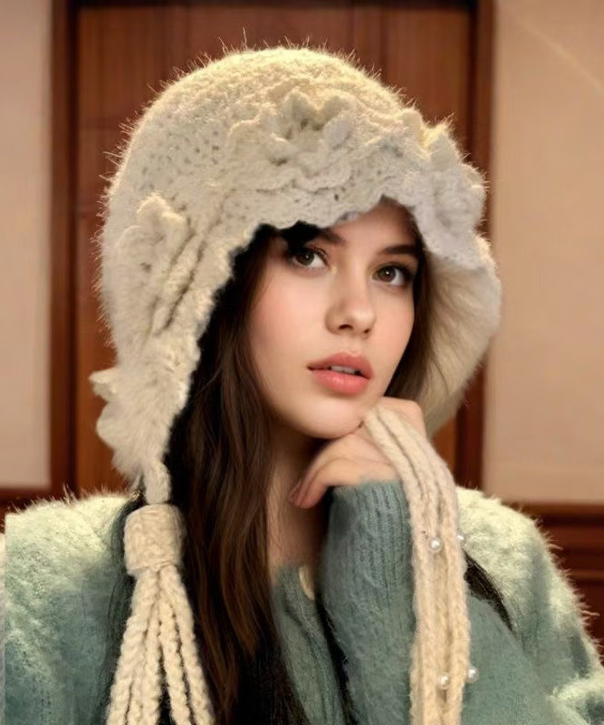 Handmade Beige Floral Tassel Nail Bead Wool Knit Boonie Hat