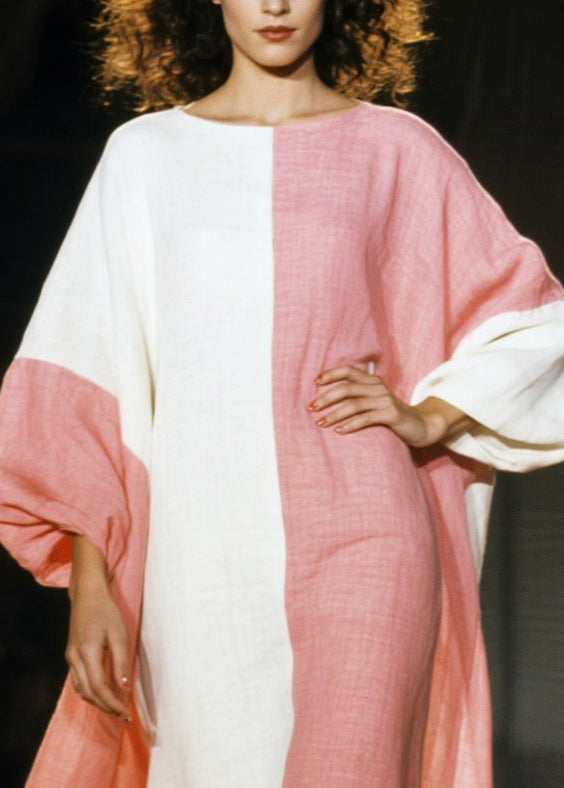 Boho Pink Asymmetrical Patchwork Cotton Dresses Lantern Sleeve