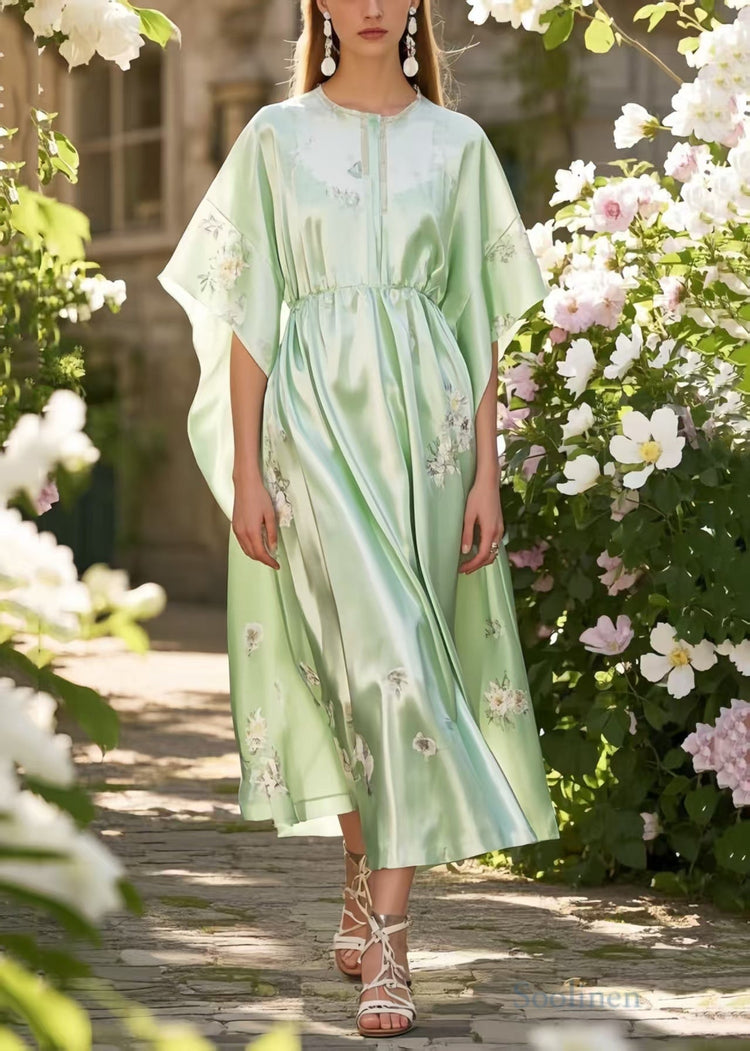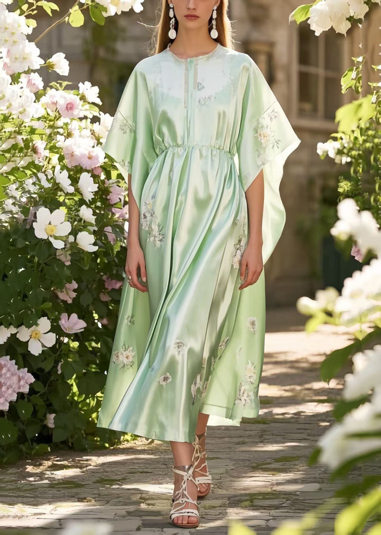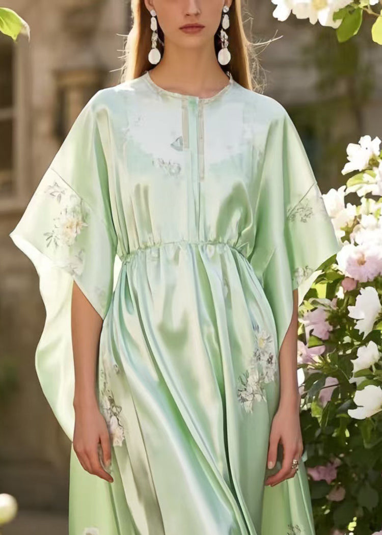 Classy Fruit Green Print Silk Holiday Dress Batwing Sleeve
