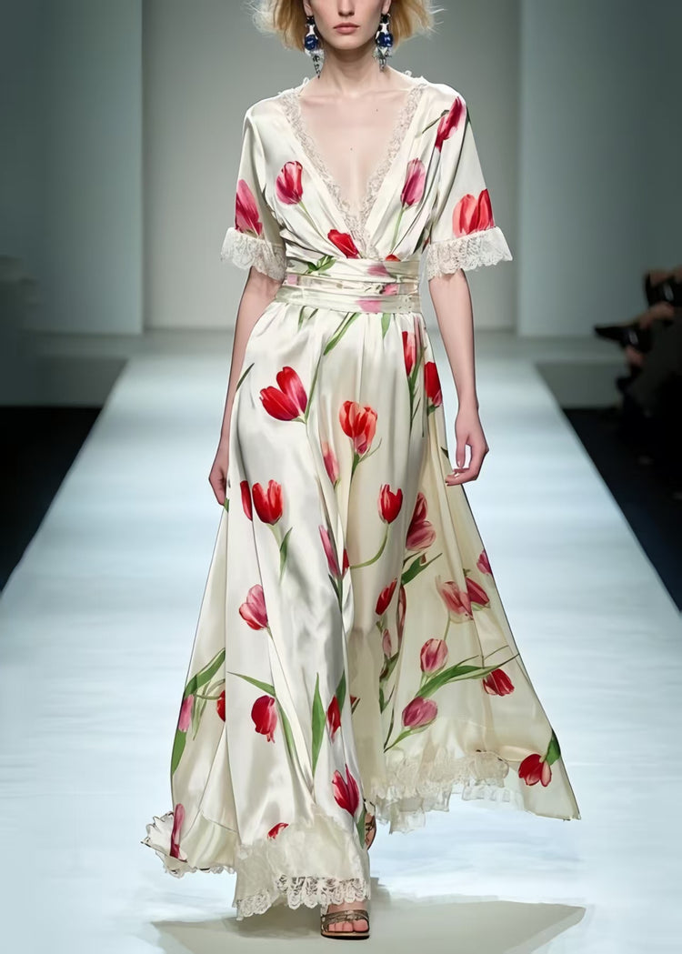 Elegant White Floral Print Patchwork Lace Long Dress Summer