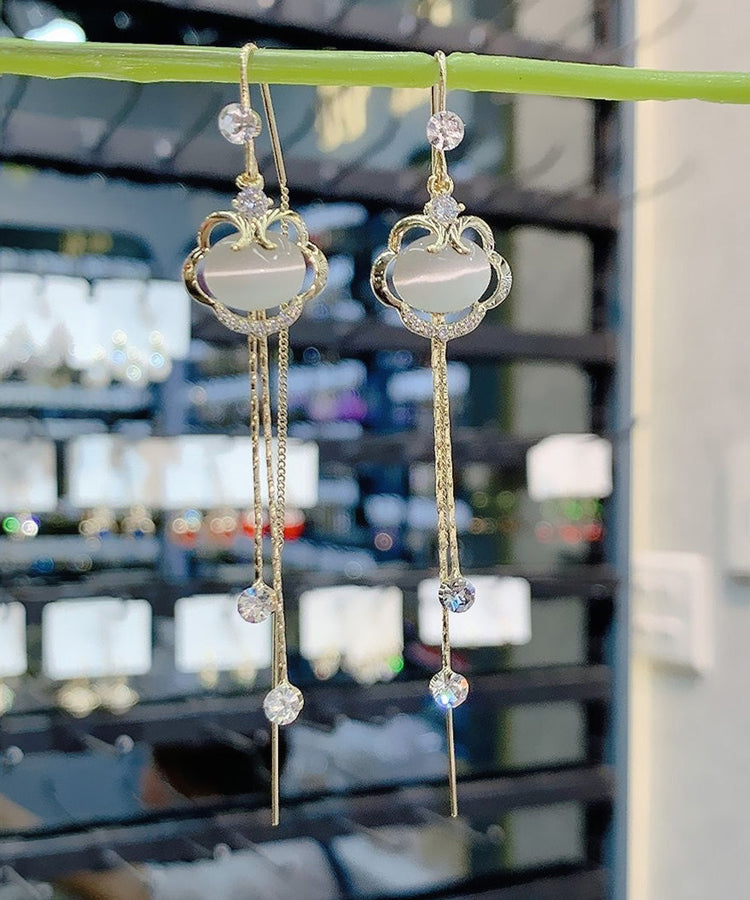 Fine Gold Copper Zircon Cat's Eye Stone Safety Lock Tassel Drop Earrings