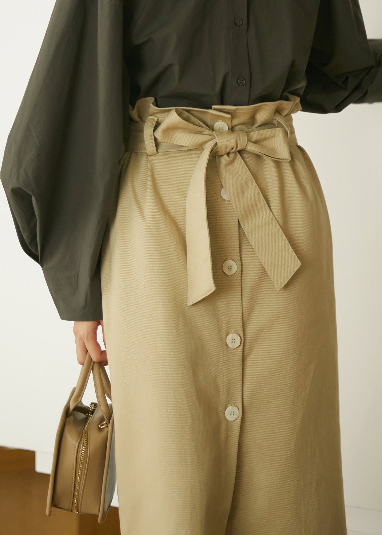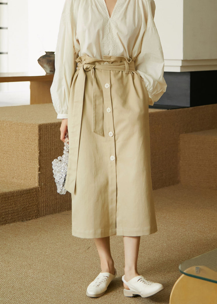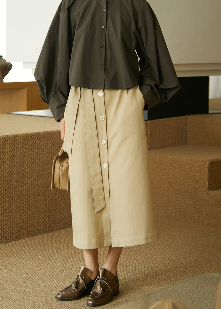 Italian Khaki Pockets Lace Up Button Cotton Skirts Summer