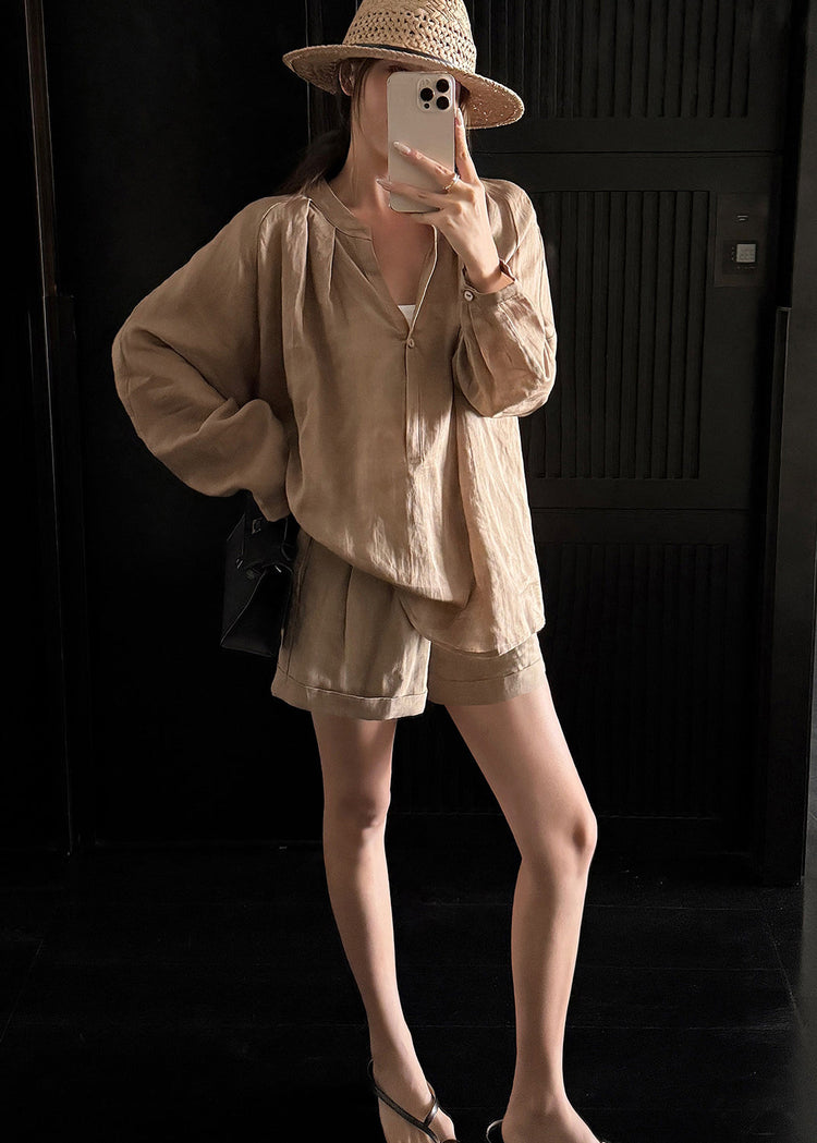 Loose White Long Sleeve Top And Shorts Linen Two Pieces Set