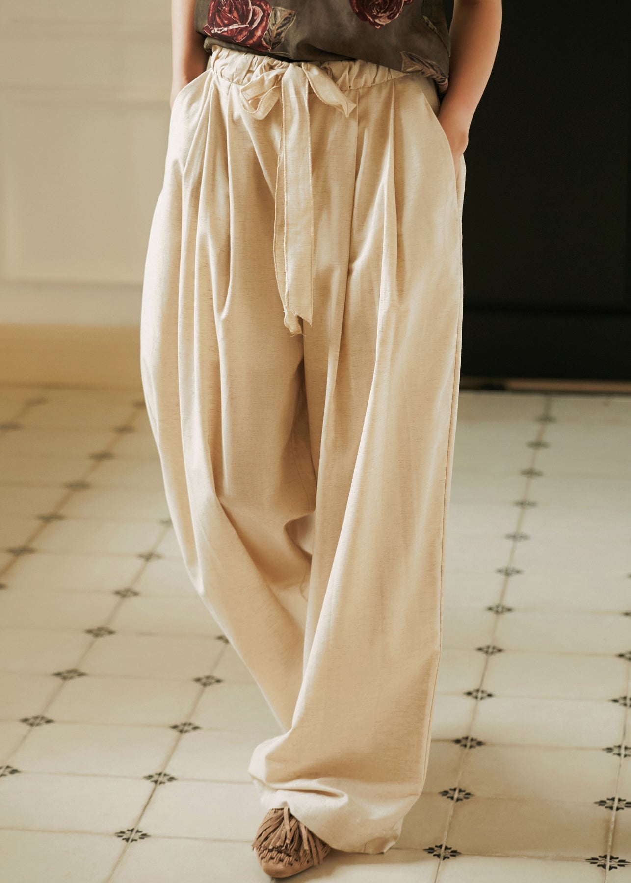 Summer Linen Color Lace Up Top And Wide Leg Pants Two Pieces Set