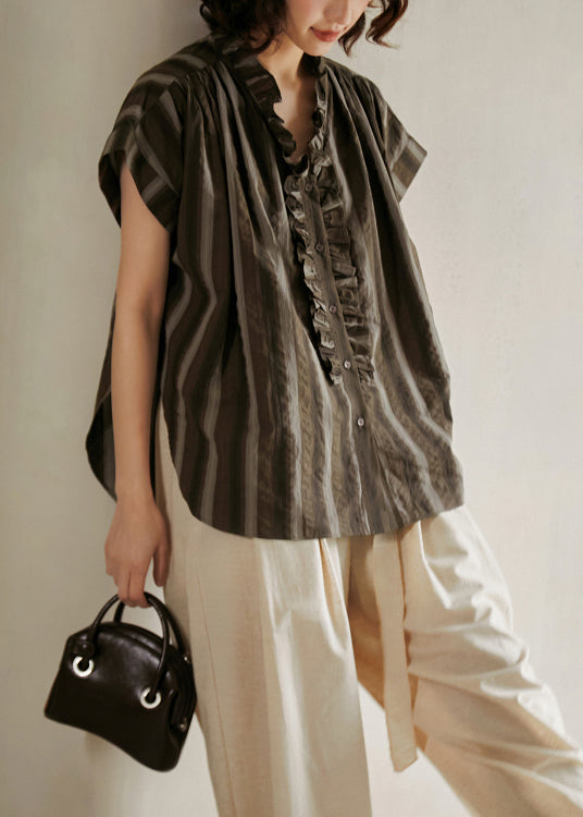 Women Blue Ruffled Striped Cotton Blouse Top Summer