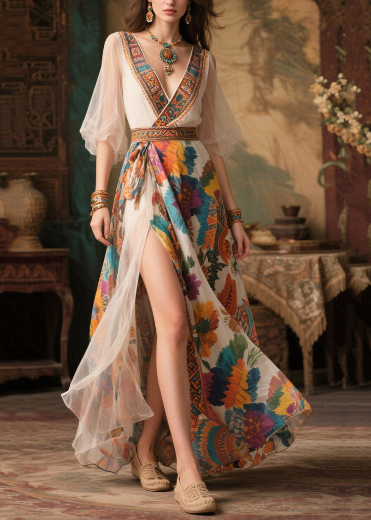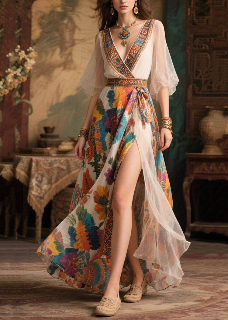 Apricot Print Chiffon Dress Exra Large Hem Side Open Summer