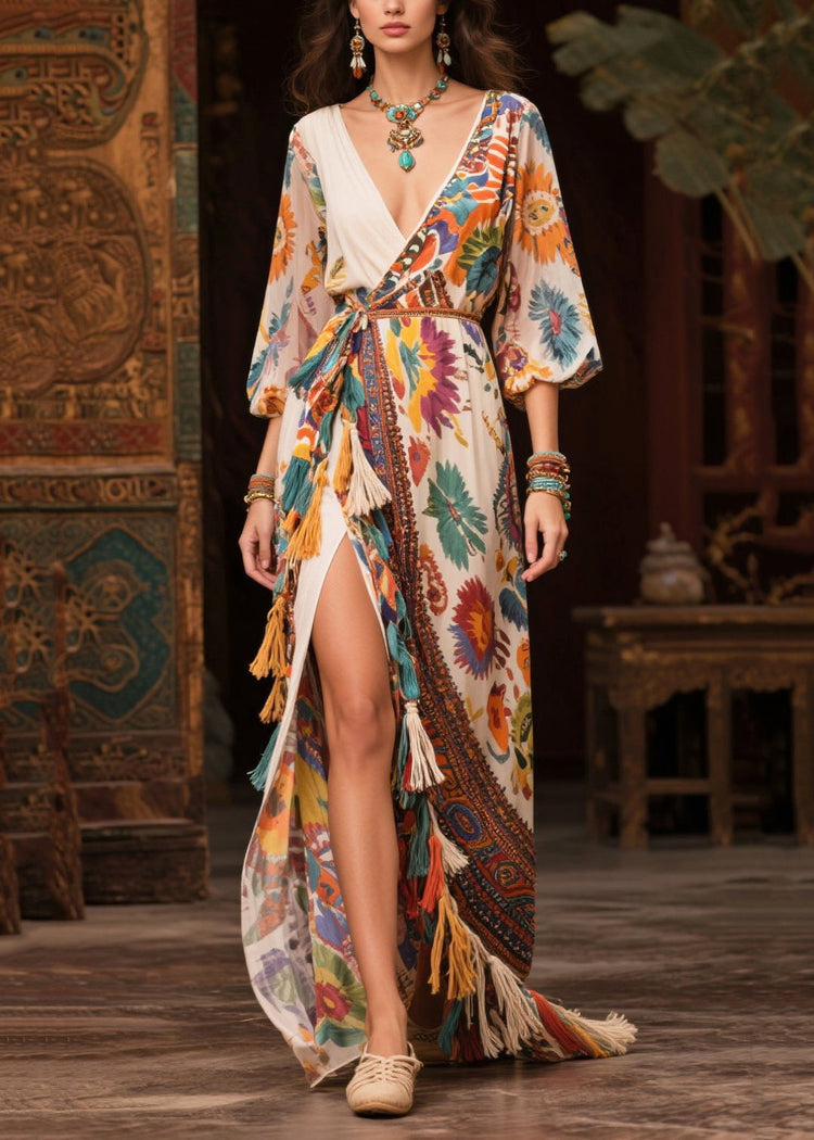 Bohemian Beige Tasseled Print Chiffon Maxi Dresses Lantern Sleeve